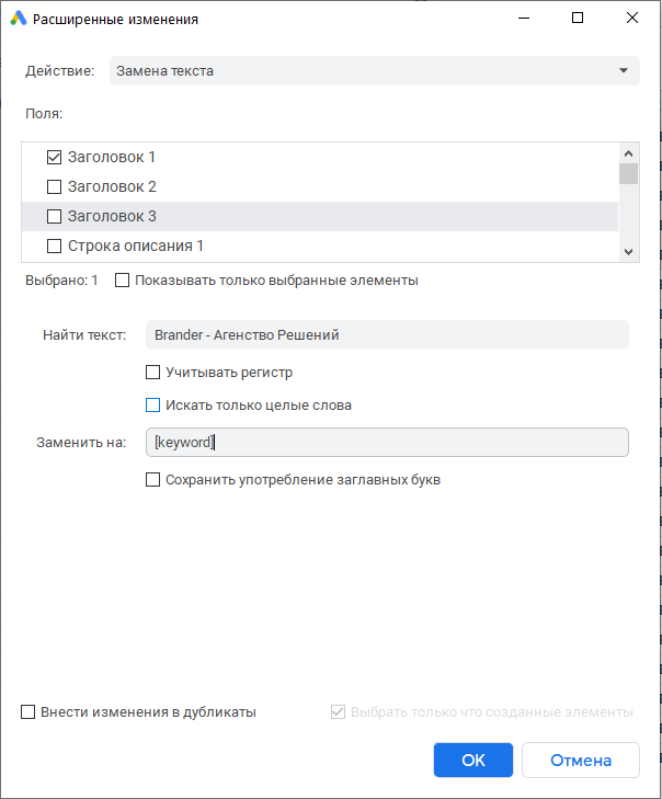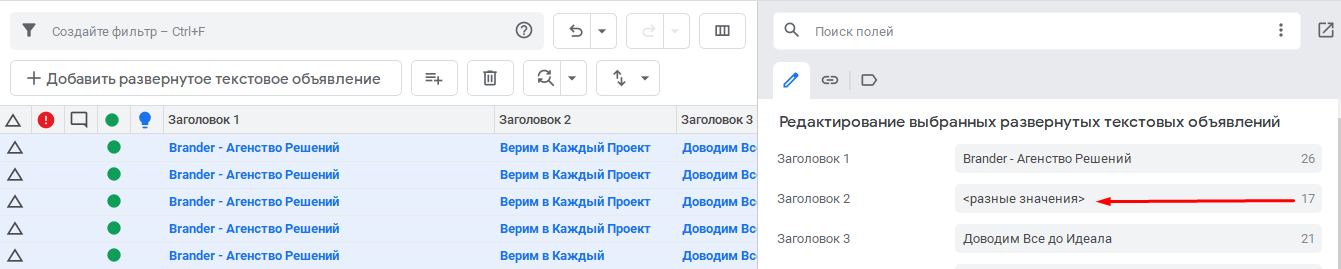 Корисна фішка, коли потрібно щось поміняти в рекламній кампанії. Наприклад, розглянемо ситуацію: необхідно розмістити інформацію про акцію у другому заголовку. Якщо у вас кілька оголошень, то вручну поміняти не складе труднощів, але якщо їх понад 100, в такому разі допоможе автозаміна.