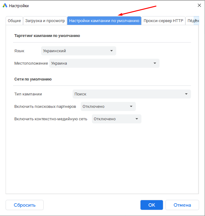 Якщо потрібно створити кілька кампаній однакового типу, зручно буде використовувати налаштування за замовчуванням. Це дуже економить час. Пропишіть у налаштуваннях потрібний тип кампанії, мову, місцезнаходження, увімкніть або вимкніть пошукових партнерів.