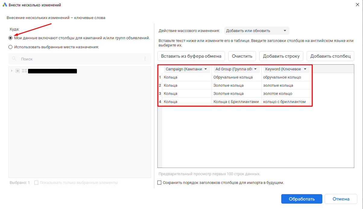 Далі натисніть "Обробити", і потрібні ключові слова з’являться в необхідних стовпцях. Цей спосіб також підійде, якщо пошукова рекламна кампанія тільки створюється — вкажіть назви кампаній та груп, а едитор самостійно створить їх.