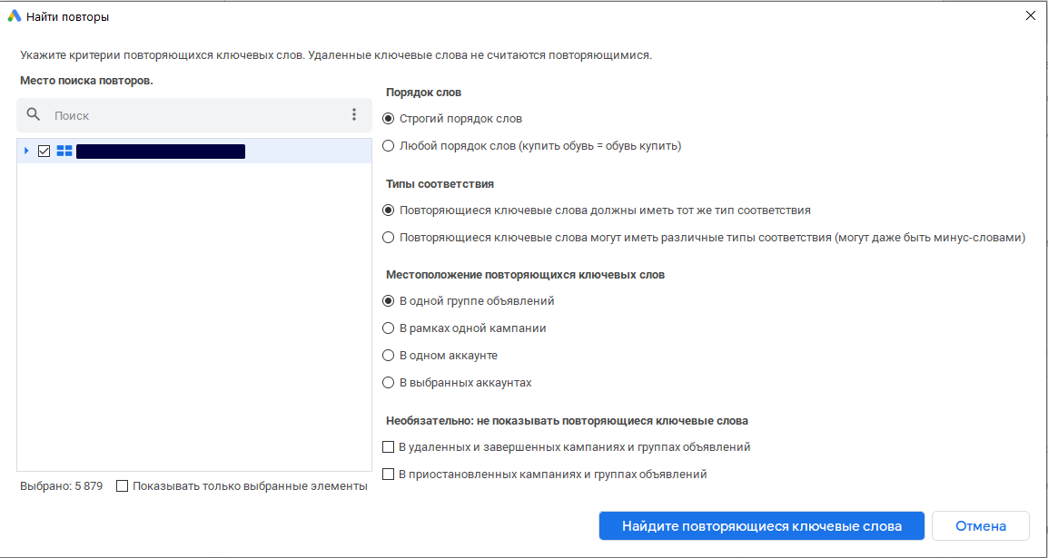 Далі у вікні виставляємо критерії, за якими плануємо шукати дублі, і тиснемо "Знайти повторювані ключові слова". Рекомендуємо робити про всяк випадок 2 перевірки: першу з ключовими словами в строгому порядку, другу — в будь-якому порядку.