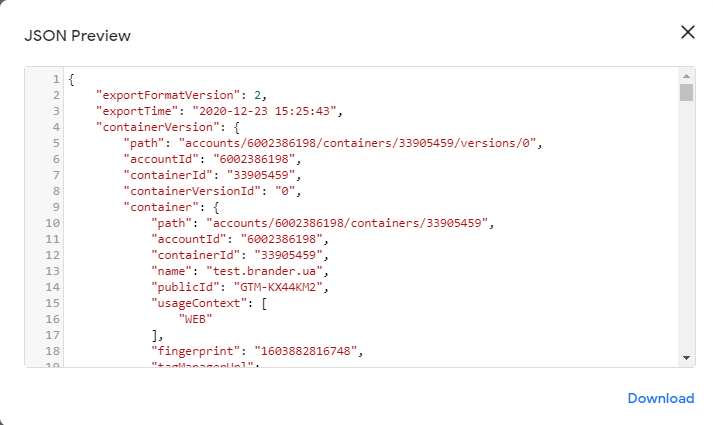 Оскільки контейнер імпортується у форматі .json, ми можемо переглянути вміст такого файлу до експорту. Я бачу мало корисного у цьому, але комусь це може стати в нагоді.