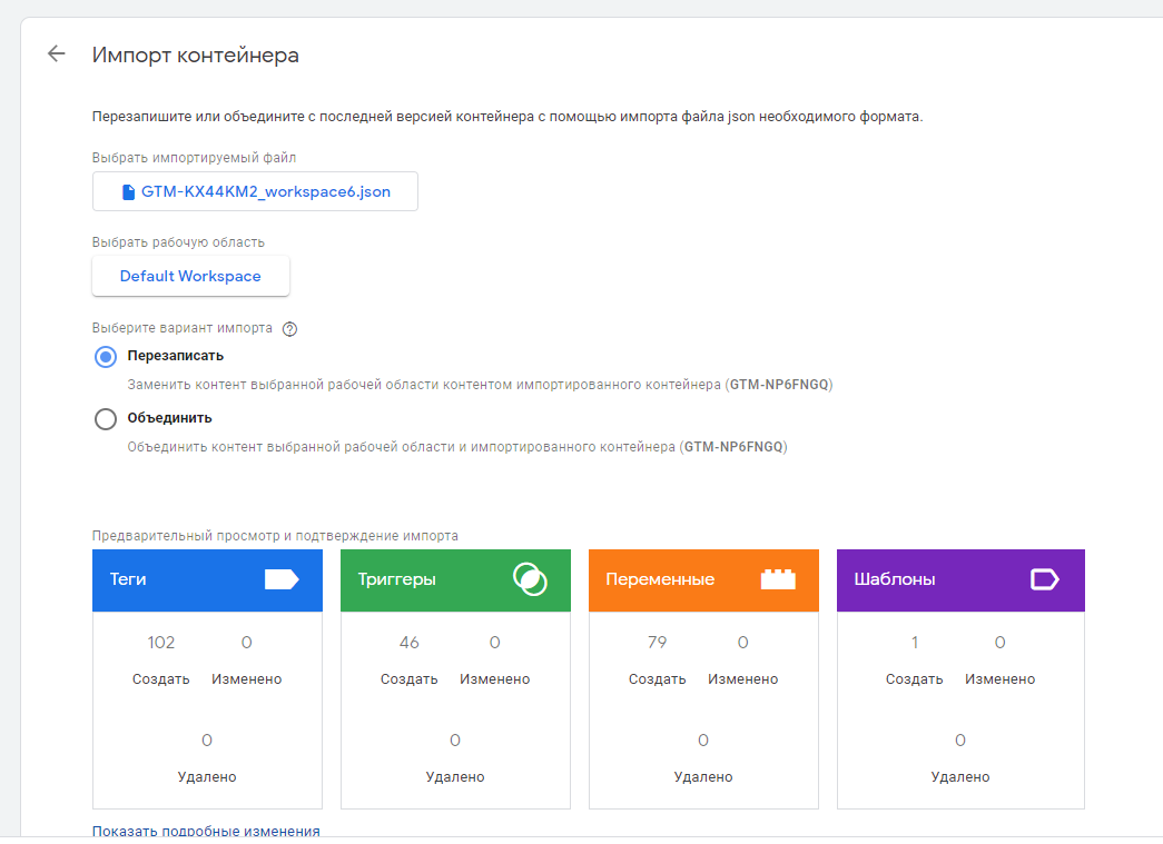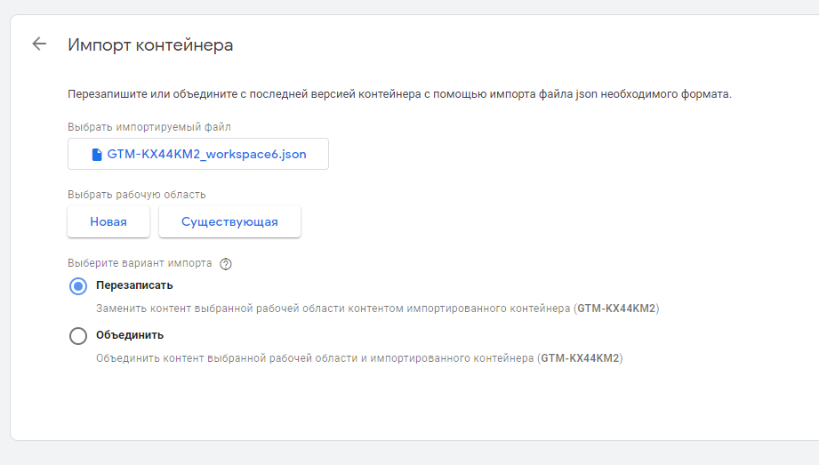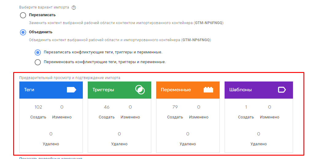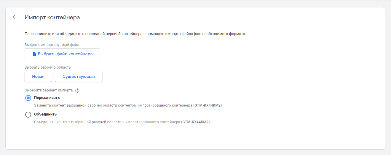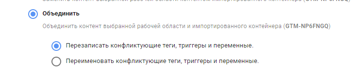 Наступний важливий етап — вибір варіанту імпорту. Тут потрібно бути уважним, тому що якщо ви збираєтеся імпортувати в новий контейнер, де ще не проводилися роботи, будь-який варіант буде прийнятним. Але якщо в контейнері вже проведені роботи, є теги, тригери і змінні, краще обирати варіант "об'єднати". Цей варіант дозволить уникнути перезапису і видалення налаштувань, виконаних раніше. При цьому даний варіант має дві додаткові конфігурації: