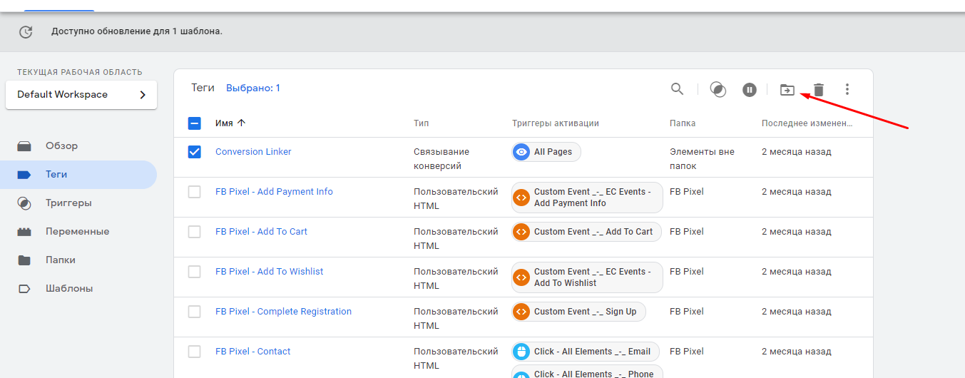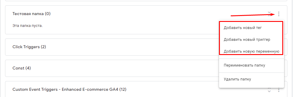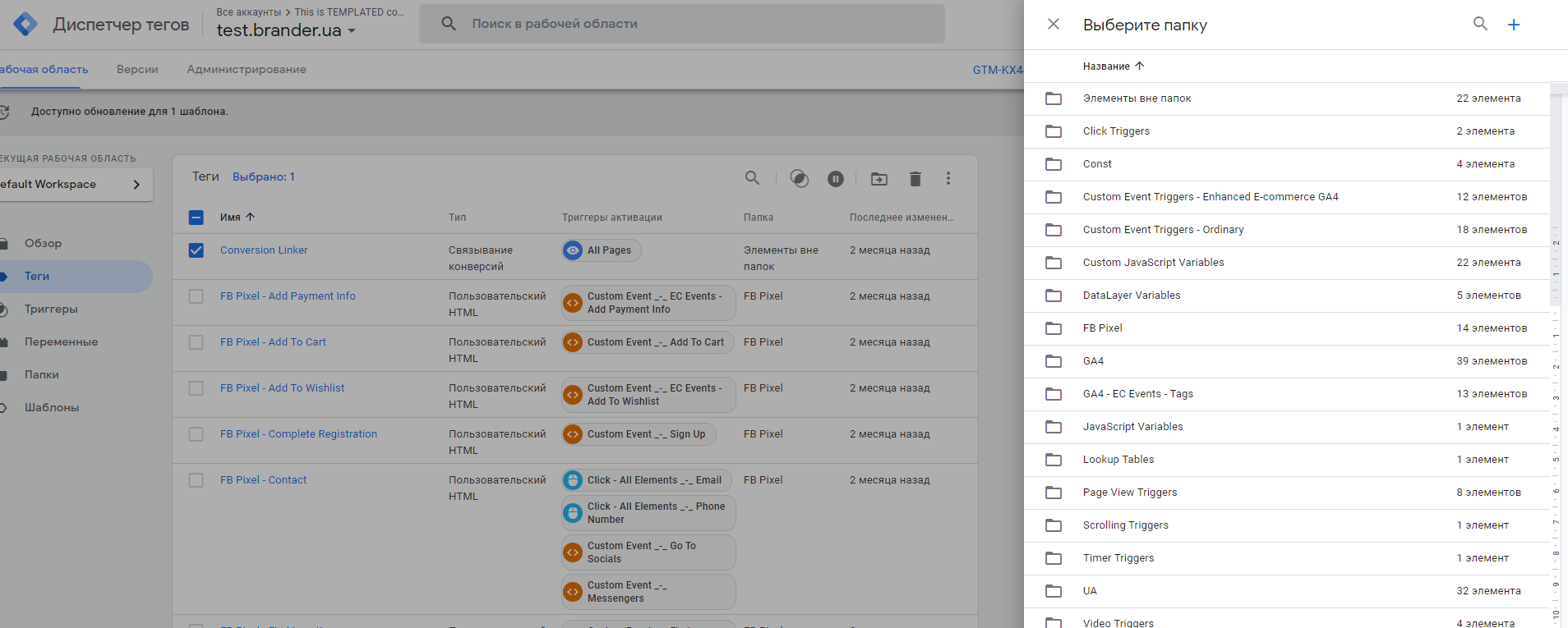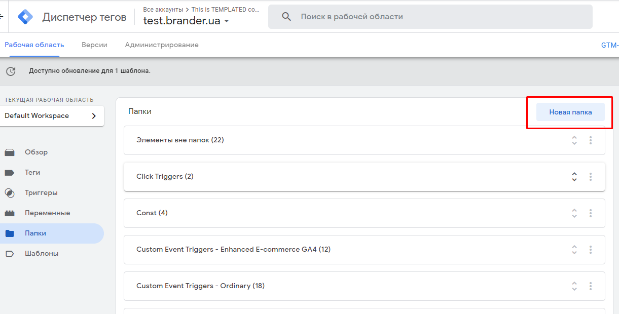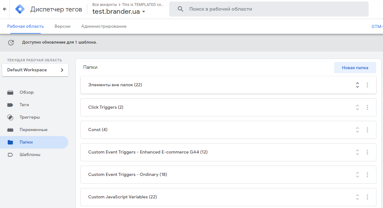 Почнемо з найбільш зрозумілого і простого — використання папок. Усередині акаунта GTM є можливість групувати елементи (теги, тригери і змінні) за зручною для вас логікою. Коли всередині акаунта дійсно багато елементів (акаунті, який показуємо для прикладу, їх понад 200), подібна сегментація допомагає знаходити потрібний елемент набагато швидше. Зокрема це корисно, коли кілька фахівців працюють з одним аккаунтом.