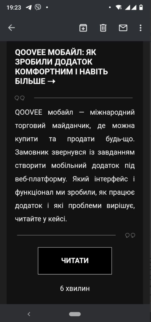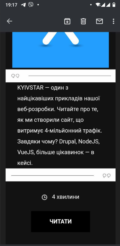 З адаптацією під мобільну версію листів розібралися, але ось тут спливає основна загвоздка, на яку емейл-маркетологи-початківці не особливо звертають уваги — темна тема (енергозберігаючий режим, нічний режим) листів для мобільного пристрою.