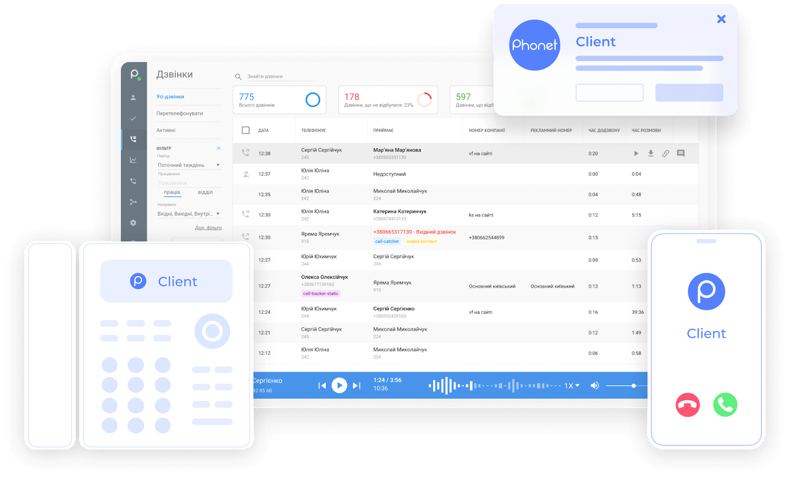 • Phonet. Якісна телефонія, яка дає змогу не просто передзвонити клієнту. Phonet надає платформу, яка об'єднує IP-телефонію, віртуальну АТС, мобільний застосунок і технології для мобільних, інтеграції з CRM.