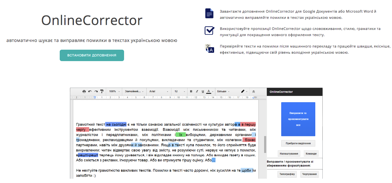 • OnlineCorrector. Ресурс, що повністю орієнтований на українську аудиторію. Це розширення для Google Docs, щоб перевірити лексику, граматику, орфографію та пунктуацію онлайн. Також є підтримка у MS Word для роботи з текстами в режимі офлайн.