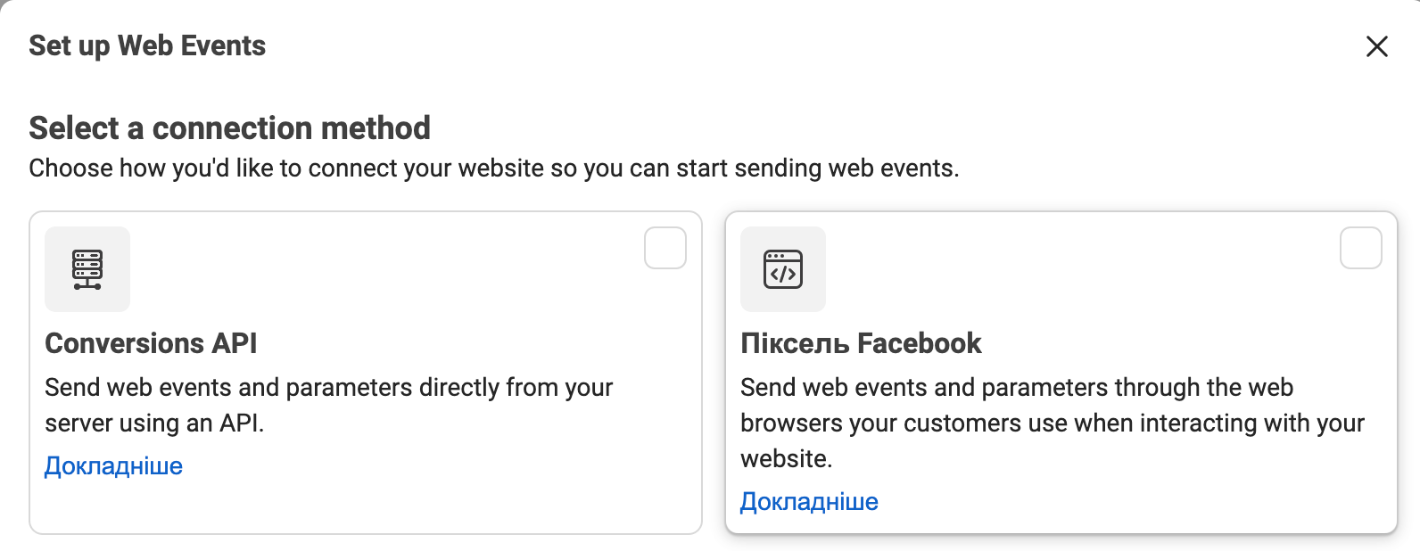 Існує два способи передачі інформації про події в Facebook. Про це повідомляє сам Facebook, коли користувач встановлює зв'язок з джерелом даних у рекламному кабінеті: