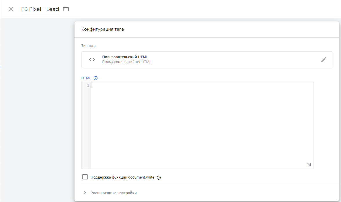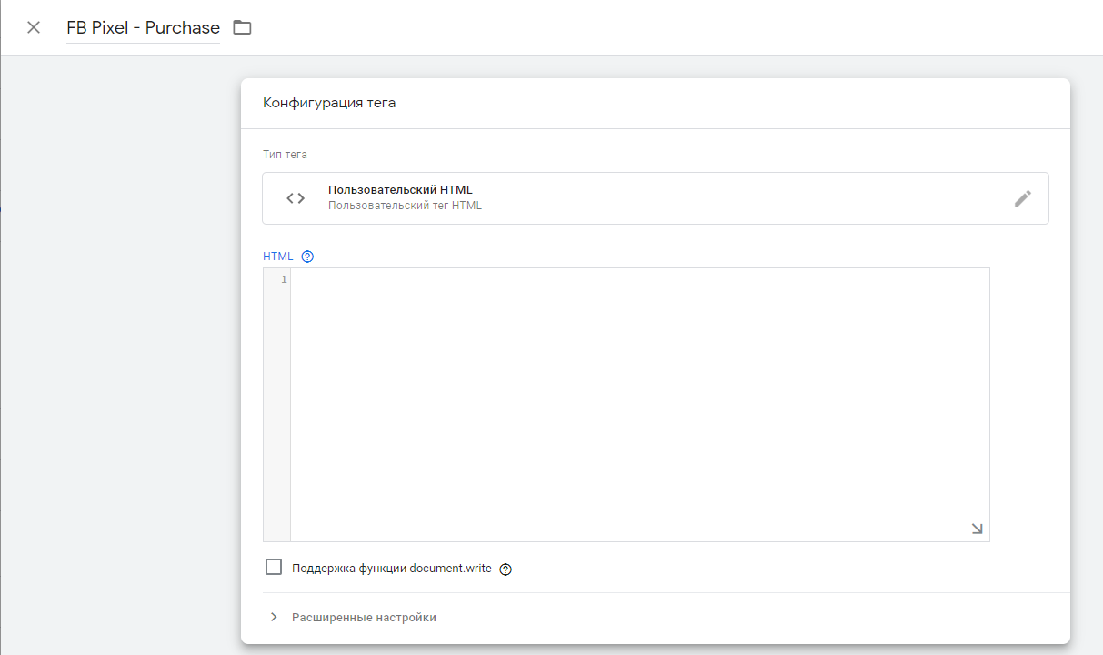 Тому варто доповнити алгоритм вище і додати до нього пару пунктів. Створюємо новий тег, вибираючи тип тега "Призначений для користувача HTML" ( "Custom HTML"):