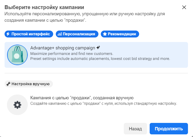 Натискаємо «Продовжити» та переходимо. Далі нам пропонується вибрати між кампанією з ручним керуванням та кампанією Advantage+. Вибираємо кампанію Advantage+.