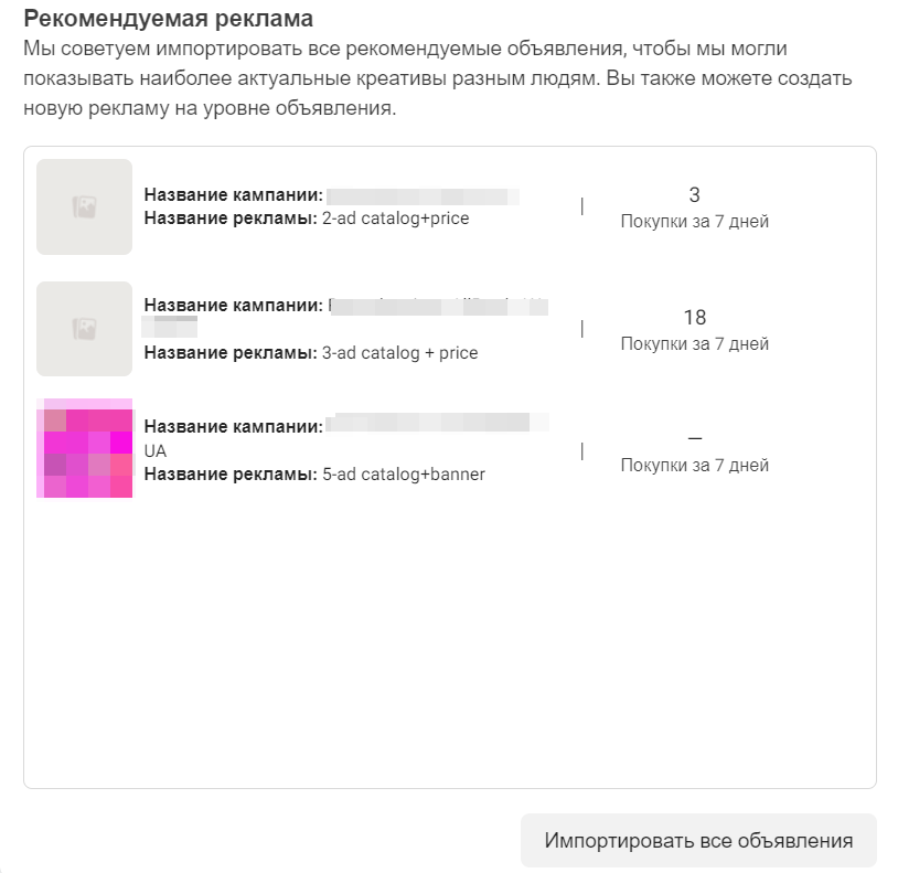 Рекомендована реклама. Багато хто оцінить цей інструмент. Meta дбає про наш час і пропонує імпортувати вже готові оголошення. Самі оголошення вибирають алгоритм з урахуванням даних. Ми можемо вибрати певні оголошення або додати все одразу. Ви також можете створити нову рекламу на рівні оголошень. Чесно кажучи, радий був скористатися цією функцією й заощадити собі час.