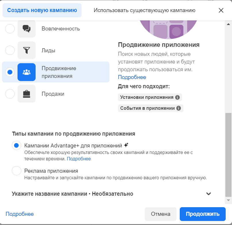 Як це зробити? Переходимо в Ads Manager, створюємо кампанію «Просування додатків», вибираємо кампанію Advantage+ для програм.