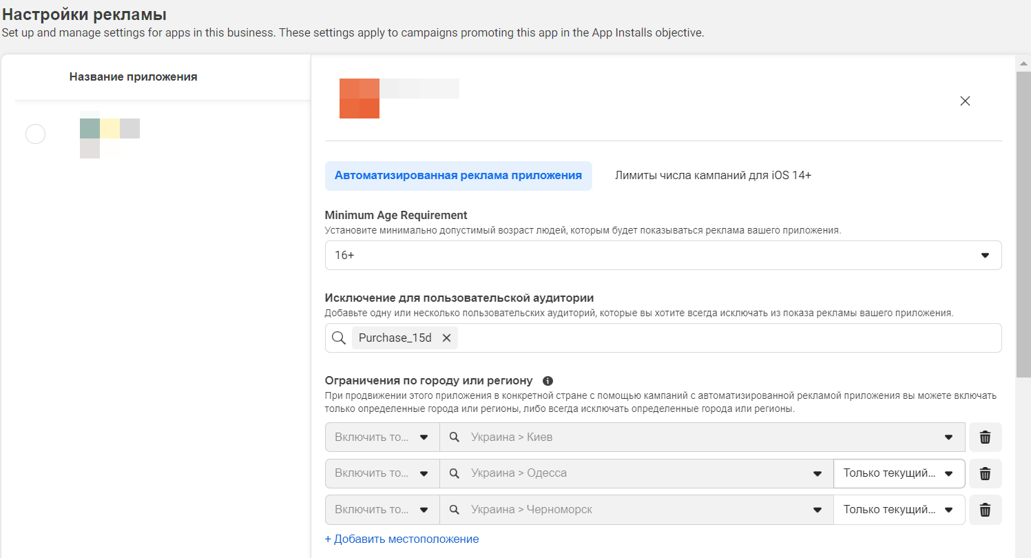 Деякі зміни торкнулися й кампанії Advantage+ для програм. Якщо ви користувалися й до цього AAA кампанією, то нічого нового не виявите. Але є одна крута зміна. Проєкти з обмеженням гео тепер теж можуть використовувати цей тип кампанії. У налаштуваннях реклами в розділі «Додатки» з’явилася можливість змінювати налаштування аудиторії: встановлювати мінімальний допустимий вік, виключати аудиторію користувача, додавати або виключати міста.