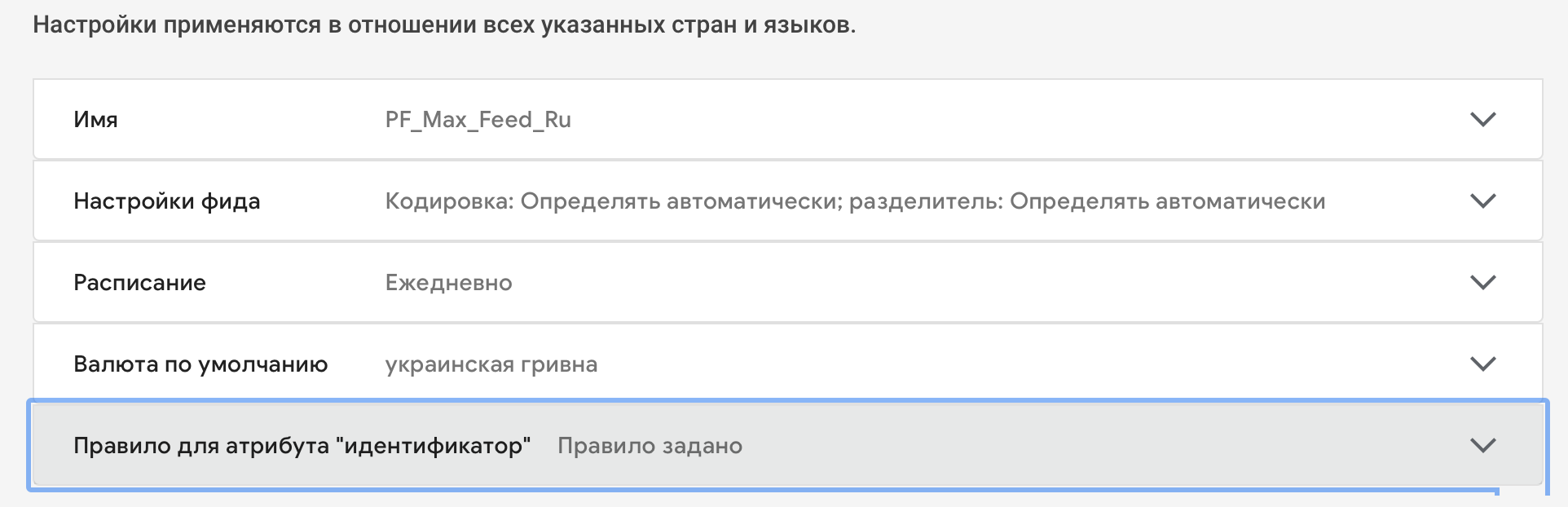 Тепер необхідно зробити товари в новому фіді унікальними. Переходимо до налаштувань фіда та відкриваємо Правило для атрибуту “ідентифікатор”.