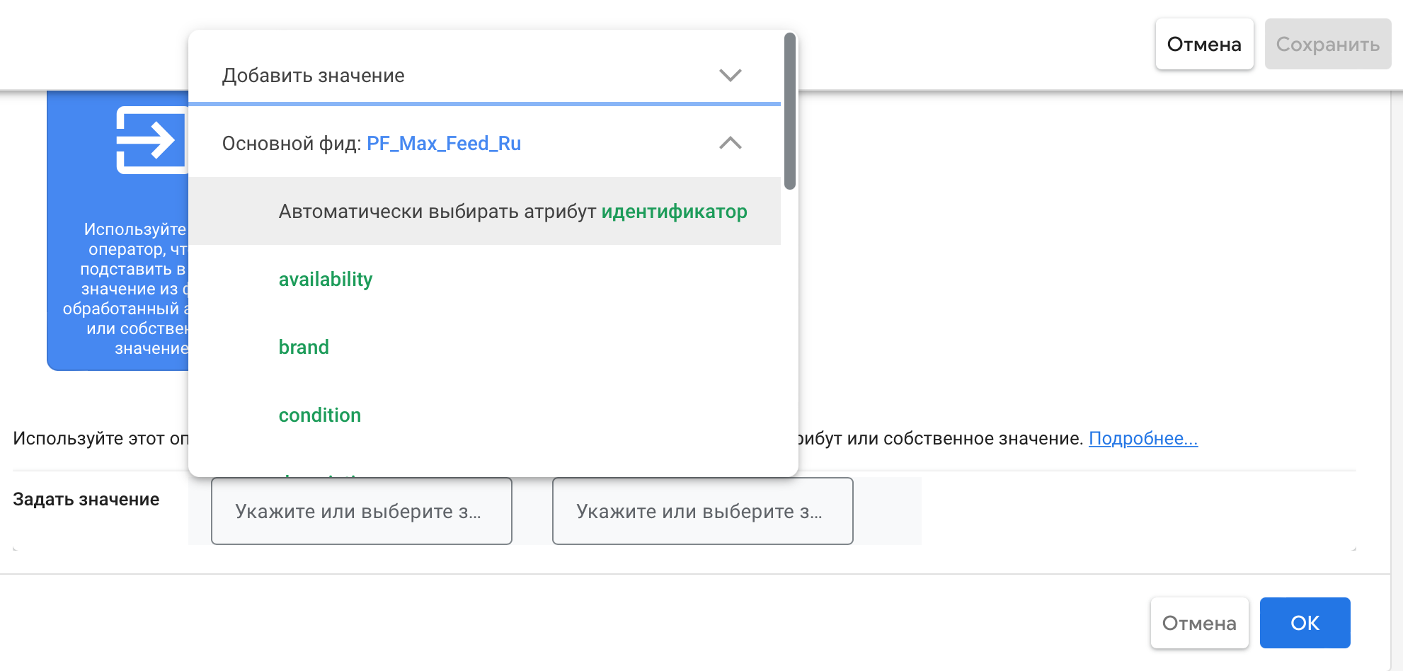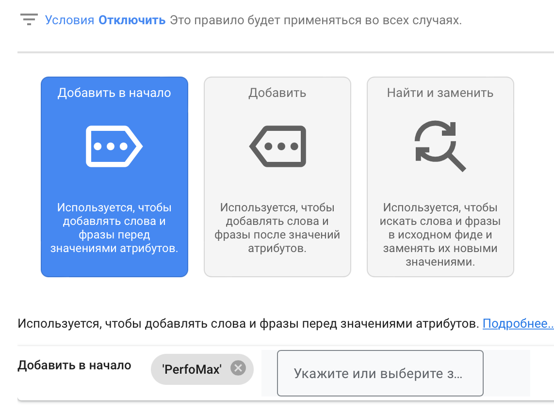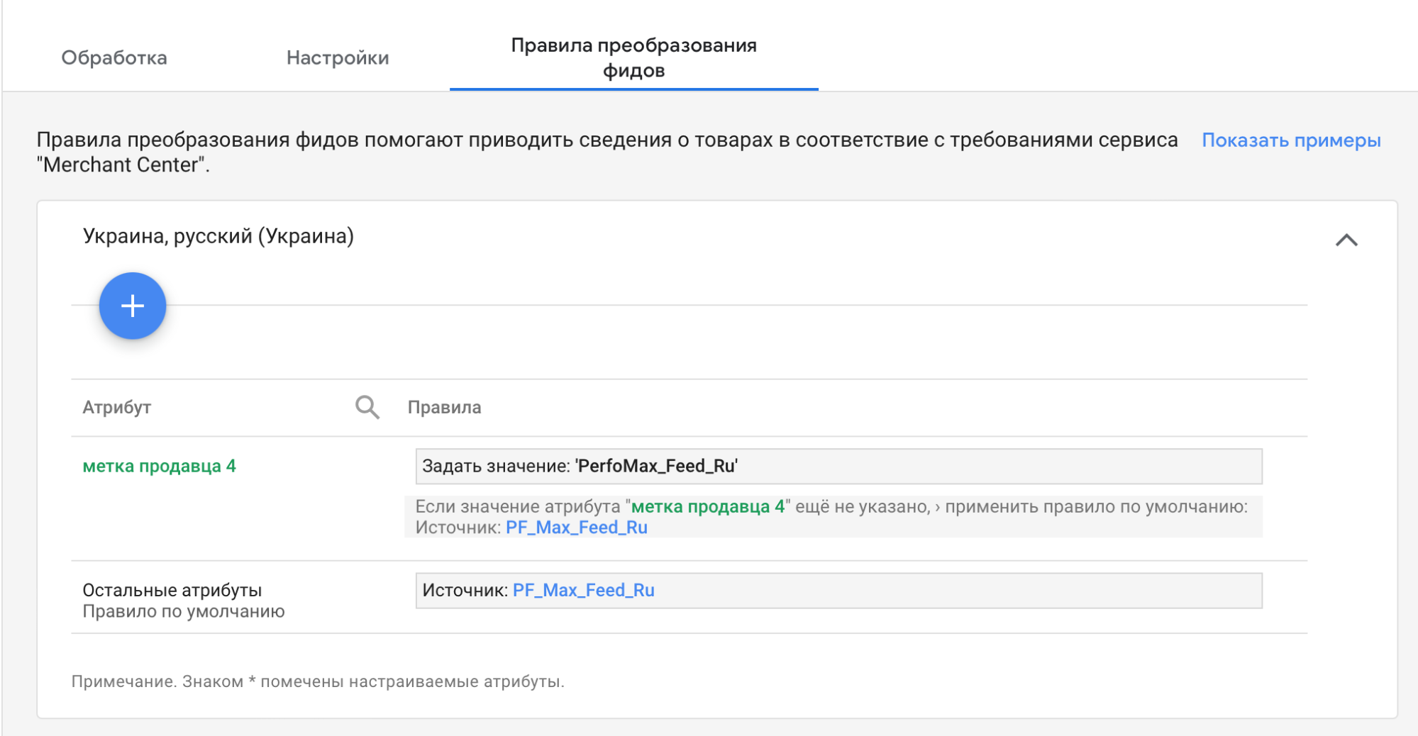 Також потрібно зручно розділити фіди через групи товарів. Робимо це через правила перетворення фідів, обравши будь-яку вільну позначку продавця. Задаємо значення для нового фіда та робимо подібну маніпуляцію вже з існуючим, але задаючи інше значення.