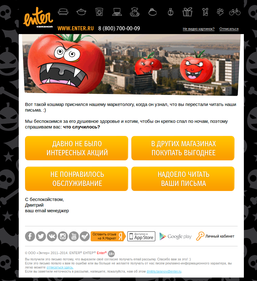 креатив, гумор Не варто боятися використовувати нестандартні підходи до реактивації. Адже підписники неактивні, вони не реагують на ваші розсилки, ви можете або їх повернути, або доведеться їх видалити з бази. По суті, ви нічого не втрачаєте. А можете тільки отримати додатковий прибуток, якщо креативний лист викличе інтерес. Приклад креативного листа: