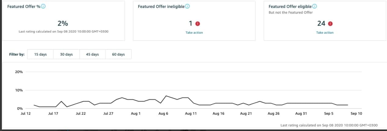 Амазон має бути впевнений, що у вас достатньо товару, щоби витримати наплив покупців, який трапиться після отримання BuyBox. Зверніть увагу на рекомендації в розділі Inventory Dashboard у Seller Central. Найкраще проаналізувати історію продажу та переконатися, що кількість товару в стоку відповідає мінімум тритижневому обігу.