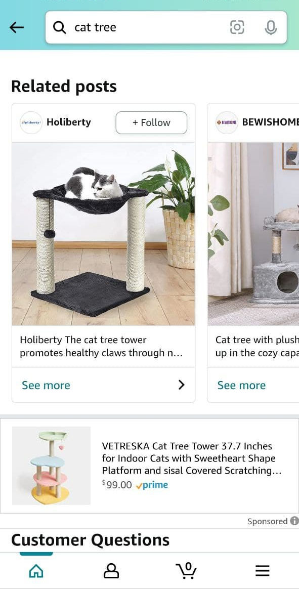 - На лістингах над розділом Customer Questions (тільки в мобільному застосунку). Тут зазвичай розміщується карусель постів зі схожими товарами. Пости автоматично розміщуються на певних лістингах, залежно від релевантності та залучення користувачів.