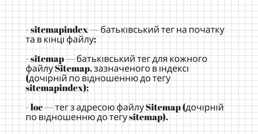 Для великого сайту формується більш одного файлу Sitemap з їх об'єднанням файлом індексу Sitemap: