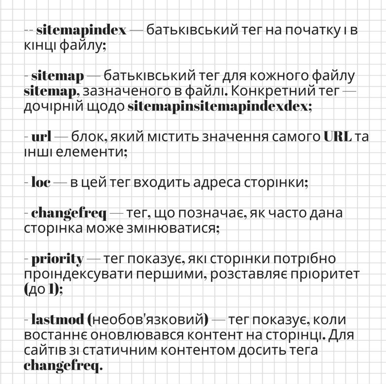 Карта сайту інформує пошукові системи про готові до сканування сторінки сайту. Sitemap — XML-файл з URL-адресами ресурсу і відповідними метаданими про кожну.