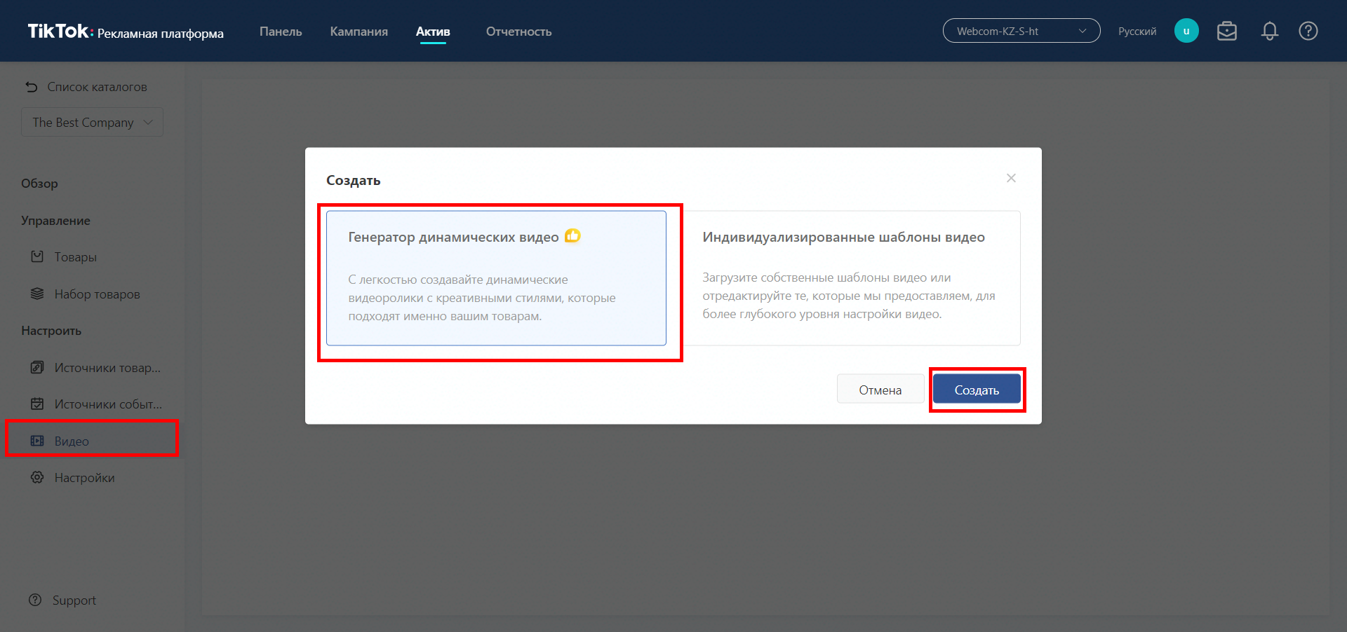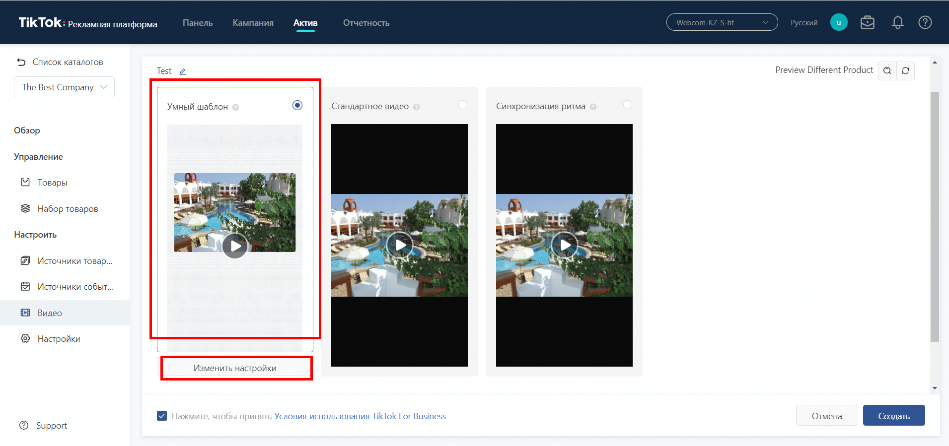 Як ми всі вже знаємо, Тік Ток — майданчик для відео. І щоби наші статичні картинки могли крутитися в рекламі, потрібно підібрати або створити відео шаблон. Заходимо в розділ «Відео» і вибираємо створити. Створення шаблону передбачає 2 варіанти: автоматичний підбір шаблону, або кастомний, який виберете саме ви. Виберемо автоматичний генератор. Цікаво, що він там нагенерує.