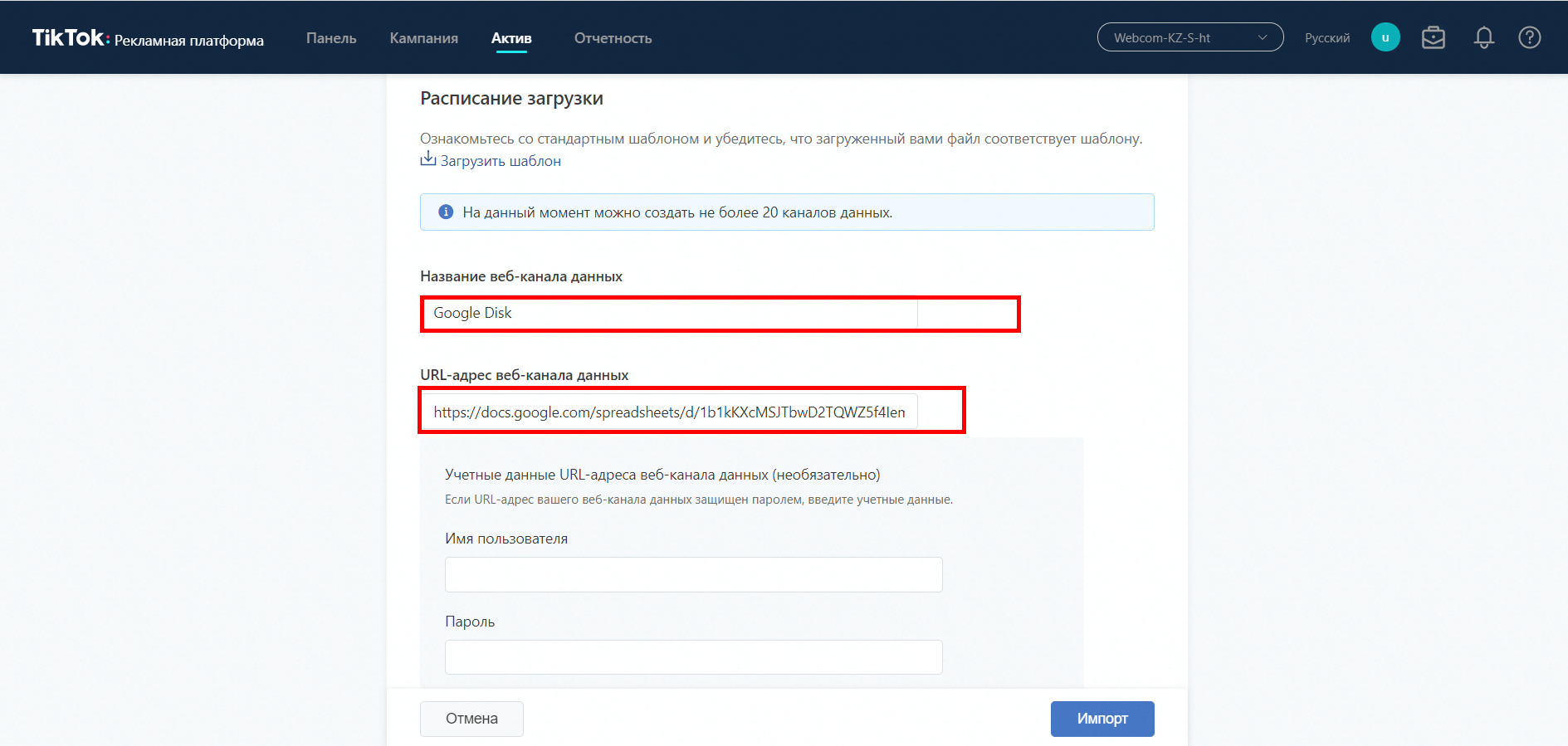 - У моєму випадку я вибрав завантаження за посиланням. Заповнюємо всі необхідні поля, а також ставимо розклад, за яким фід буде автоматично оновлюватися. Далі обираємо «Імпорт».