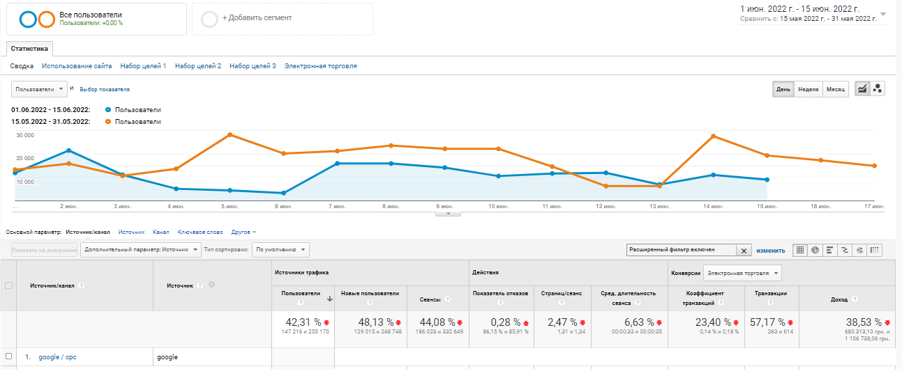 Майже всі основні показники стрімко пішли вниз із відключенням одного з джерел реклами. Як виявилось, Facebook має величезний вплив навіть на Google, свого конкурента. Цей вплив ми можемо відстежити у всіх звітах та графіках. Чи то нові користувачі,
