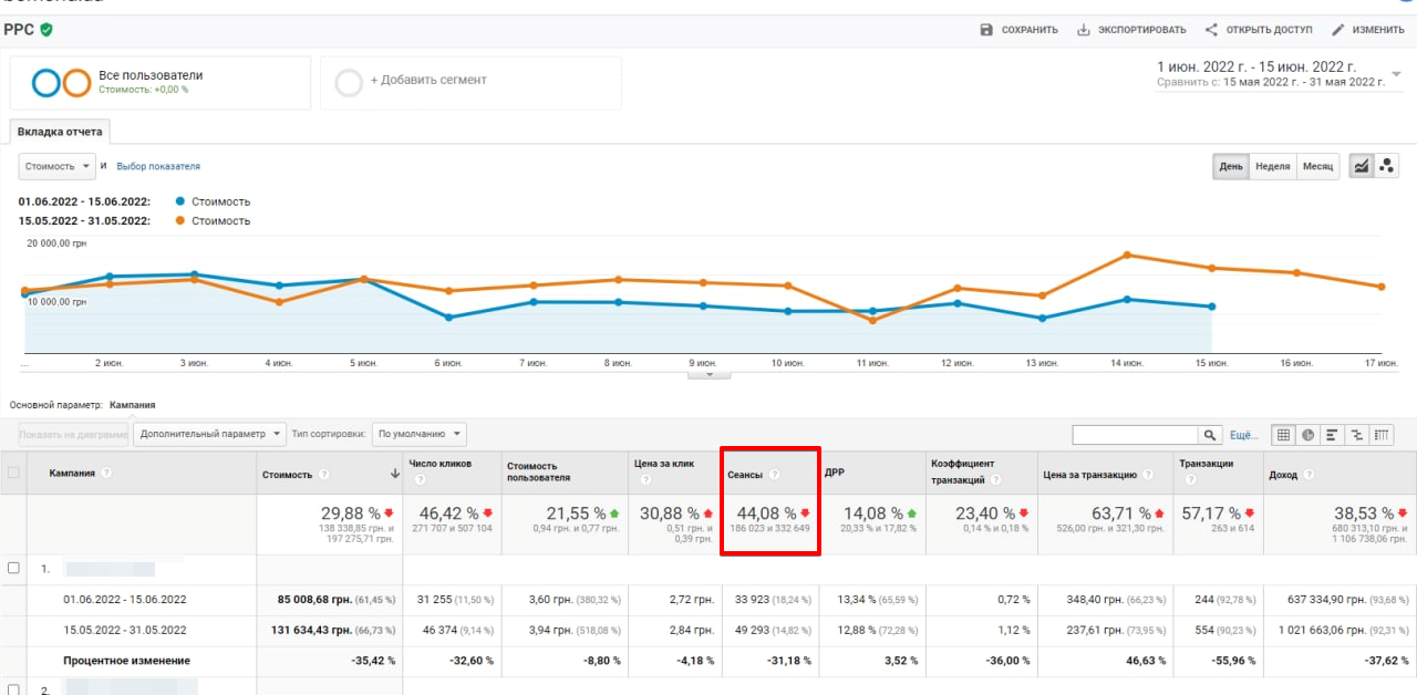 Унаслідок нижчої зацікавленості значно впав показник сеансів на сайті.