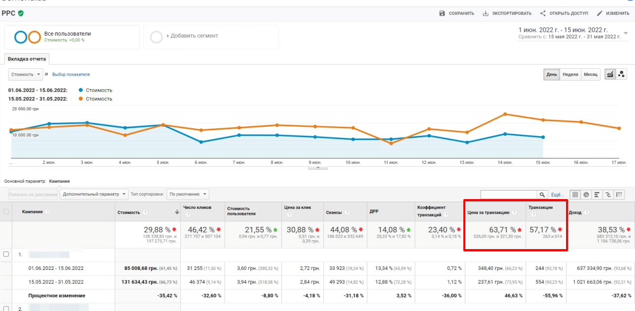 Зменшивши бюджети на Facebook Ads, ми знизили кількість торкань із нашим потенційним покупцем. Тому ціна за дію закономірно зростатиме. Більш ніж у половину зросла ціна за транзакцію й на 57 відсотків упала кількість покупок.