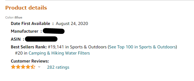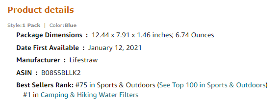 Амазон зазвичай показує рейтинг товару в широкій категорії (наприклад Sports & Outdoors), і в підкатегорії, у якій знаходиться товар (наприклад Camping & Hiking Water Filters):