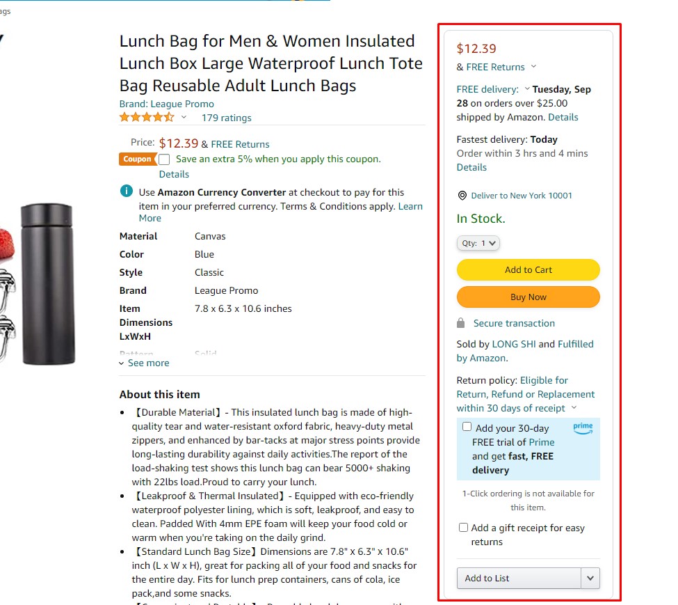 BuyBox — це прямокутна область у правому верхньому куті лістингу, яка містить кнопки “Buy Now”, “Add to Cart”, а також ціну, дані продавця та іншу додаткову інформацію: