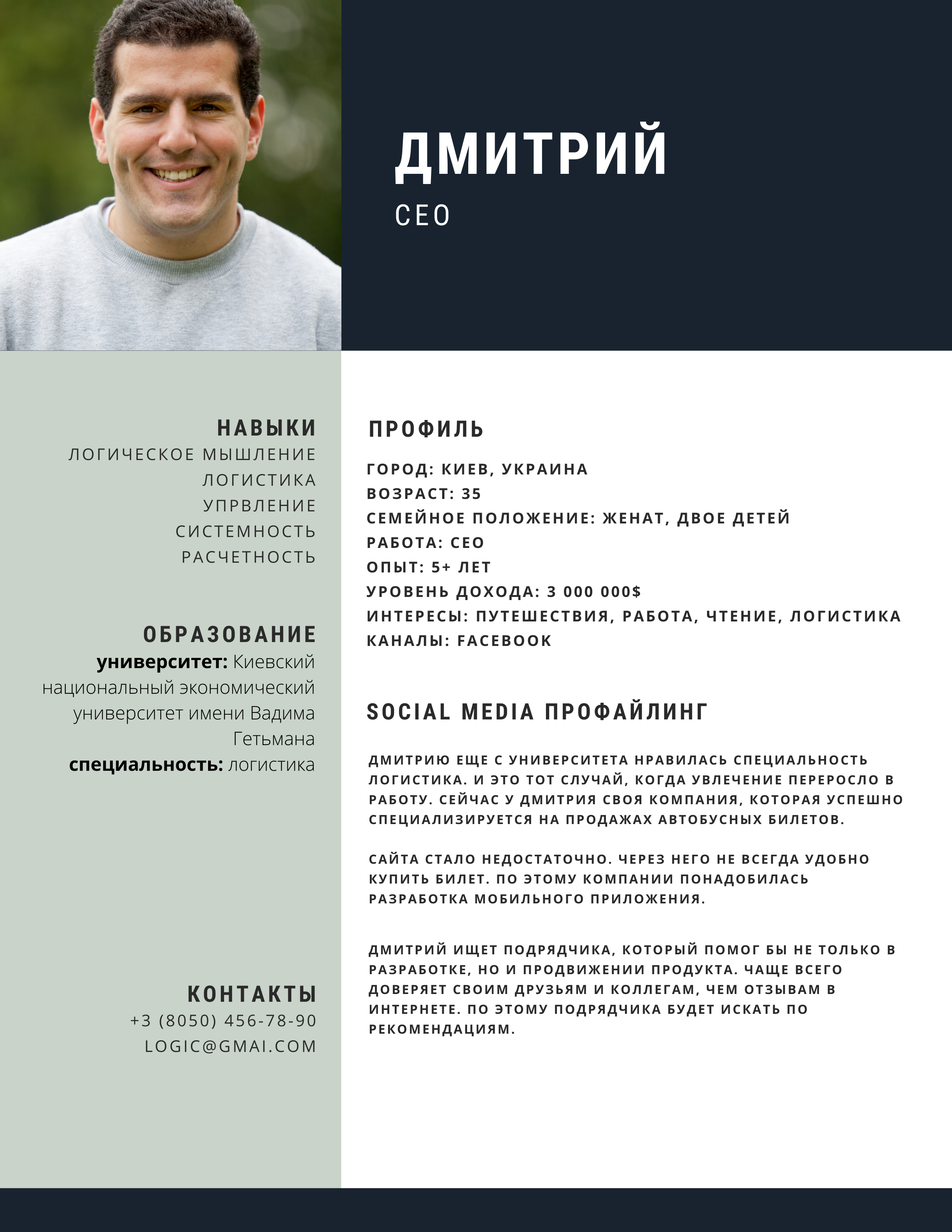Дмитро шукає підрядника, який допоміг би не лише в розробці, а й у просуванні продукту. Найчастіше довіряє друзям і колегам, ніж відгукам в інтернеті. Тому підрядника шукатиме за рекомендаціями.