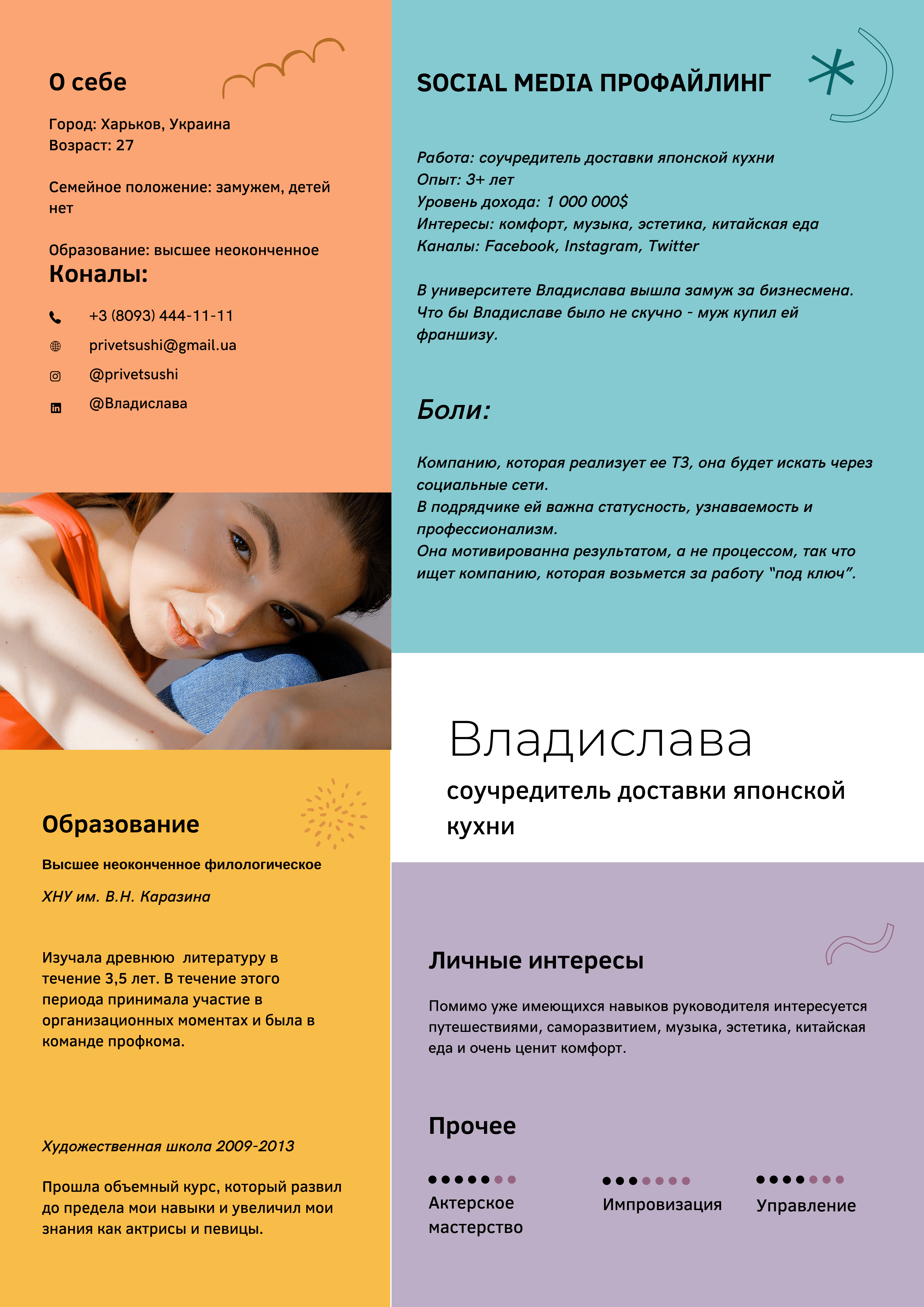 Компанію, яка реалізує її ТЗ, вона шукатиме через соціальні мережі. У підряднику їй важлива статусність, впізнаваність і професіоналізм. Вона мотивована результатом, а не процесом, тому шукає компанію, яка візьметься за роботу “під ключ”.