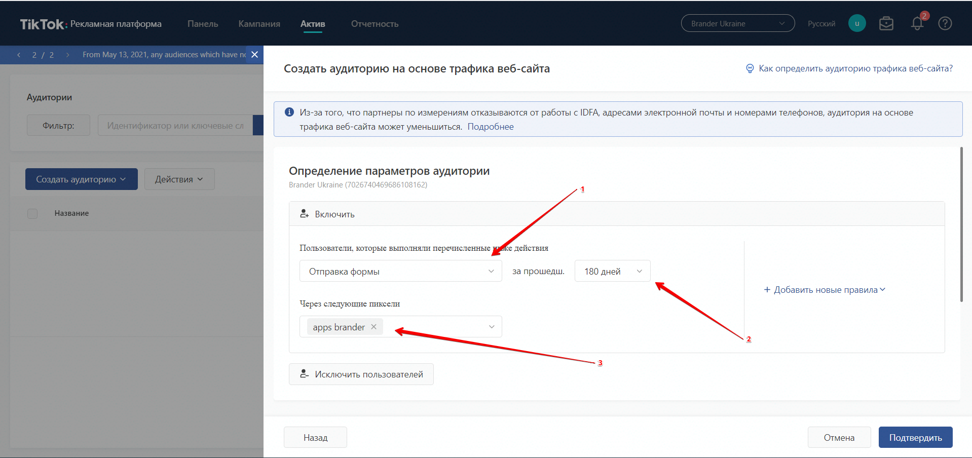 - Створення аудиторії користувачів, які залишали заявку упродовж 180 днів. Для цього заходимо до аудиторії, тиснемо Створити аудиторію, далі Трафік вебсайта. Вибираємо подію та часовий проміжок, за який потрібно зібрати дані та піксель.