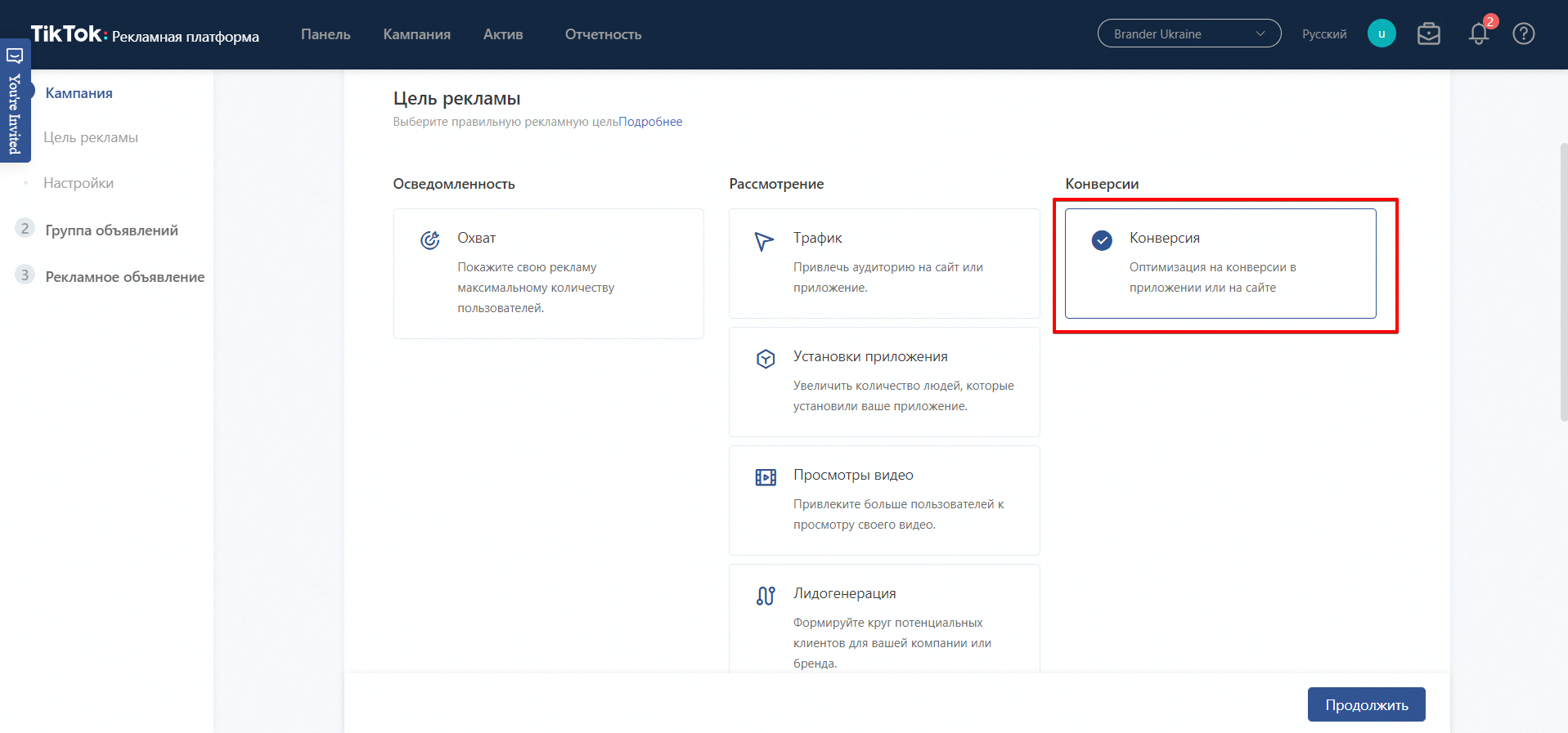 Також використовуватимемо холодну аудиторію, яку створимо в процесі налаштування кампанії. Тут розібралися. Зараз настав час зрозуміти, яка рекламна ціль нам підходить. Відмінно з поставленим завданням впорається ціль Конверсії, перейдемо до її налаштування.