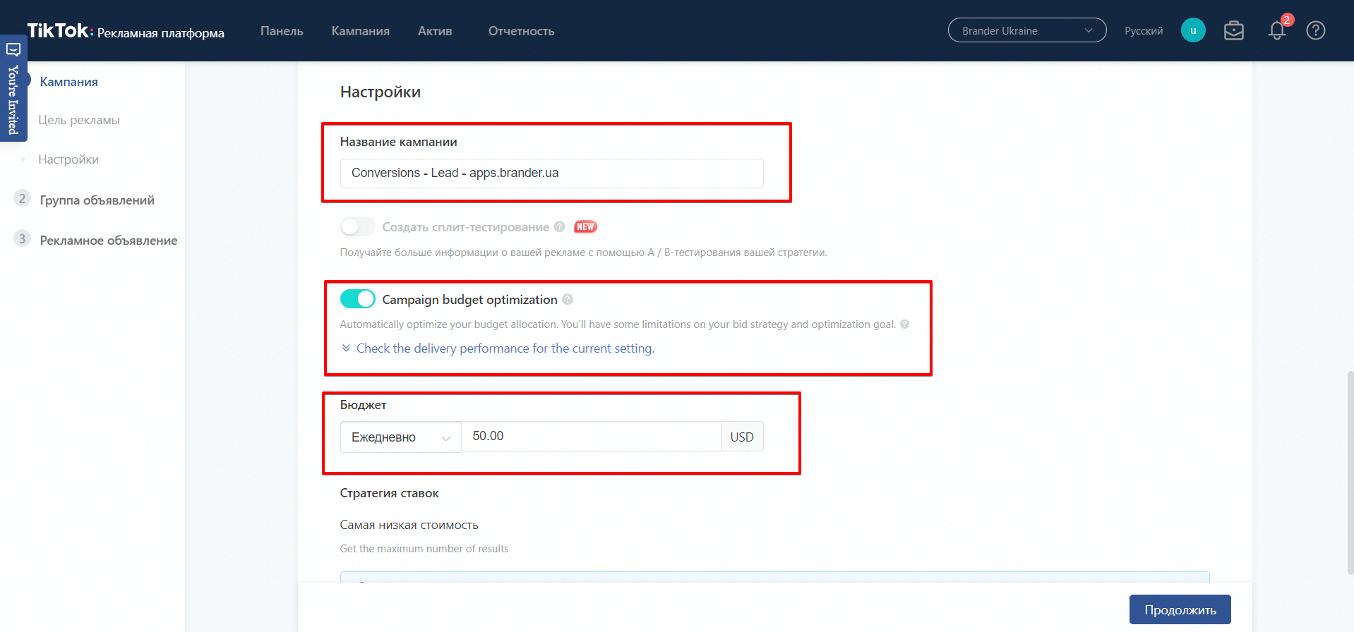 - Тиснемо створити кампанію, вибираємо Конверсія і скролімо донизу. Називаємо кампанію, ставимо обмеження за денним бюджетом (у тік ток мінімальний денний бюджет — 50$) та оптимізацію бюджету (CBO). Як працює CBO? Бюджет розподіляється між групами об’яв у такий спосіб, щоб отримати максимальну ефективність.