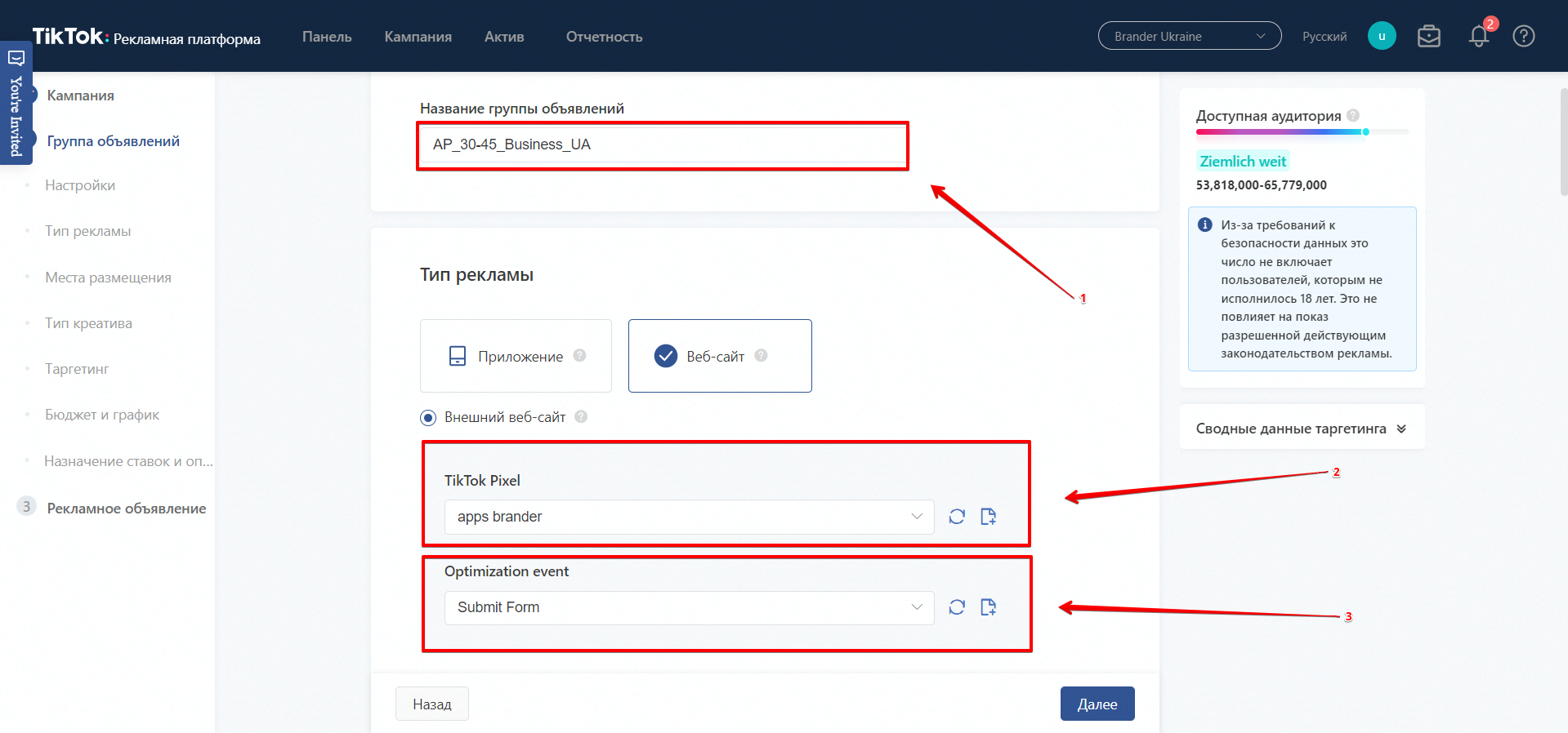 - На рівні групи оголошень вибираємо тип реклами, у нашому випадку це вебсайт. Вибираємо піксель та подію, на яку оптимізуватиметься рекламна кампанія. Визначаємось із плейсментами для реклами. Докладніше про місця розміщення можна прочитати в довідці.