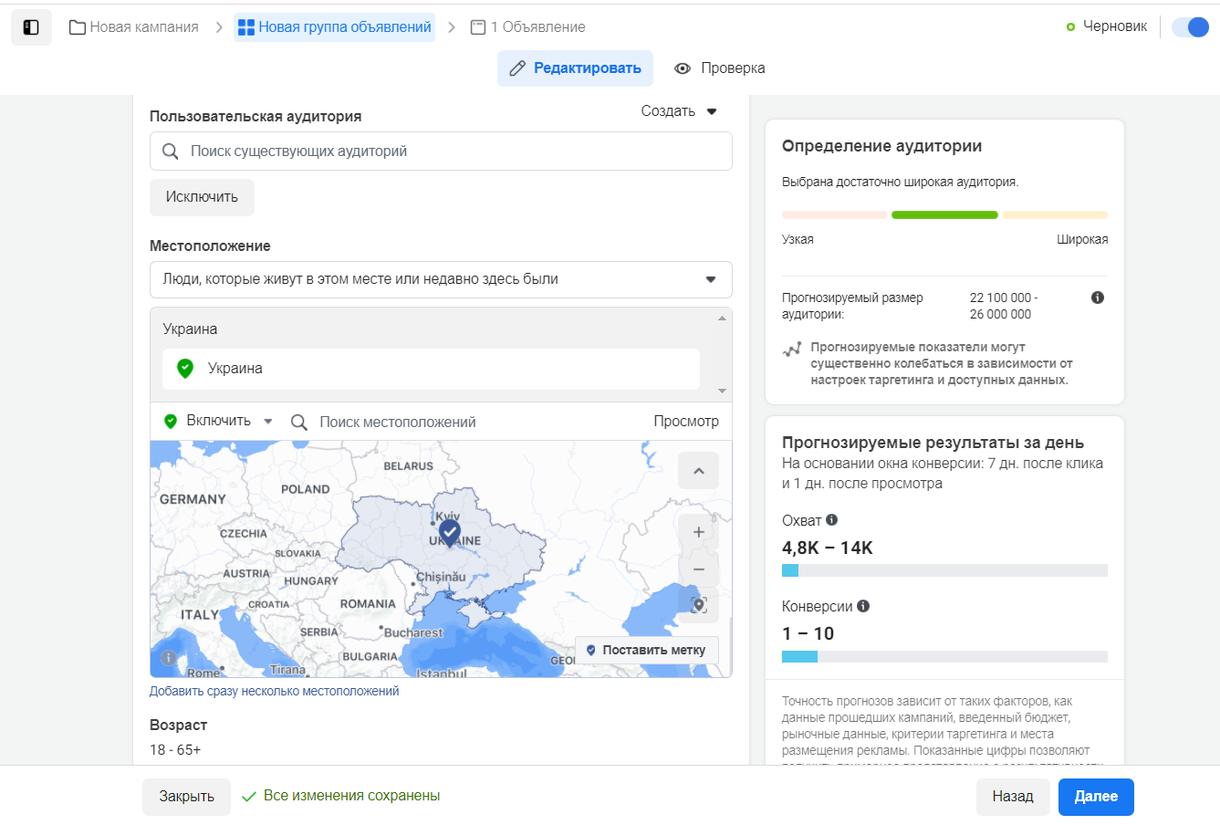 Завдання першого етапу — продумати, як залучити користувача, як його зацікавити нашим продуктом або послугою. Тут поки що не потрібна сегментація аудиторії. Наша мета — охоплення якомога більшої кількості людей. Для цього етапу підійде такий тип аудиторії у фейсбук як збережена. У цьому випадку ми зможемо обмежити нашу аудиторії за віком, гео і, якщо необхідно, за інтересами.