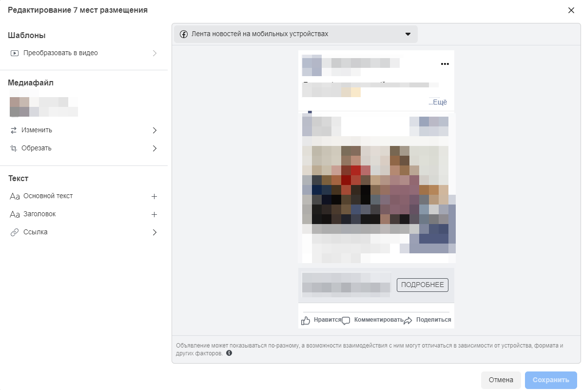 Щоби заощадити час на підготовку креативів із різними розмірами, в Ads Manager є функціонал, який дає змогу підігнати креатив під вибране вами місце розміщення реклами.