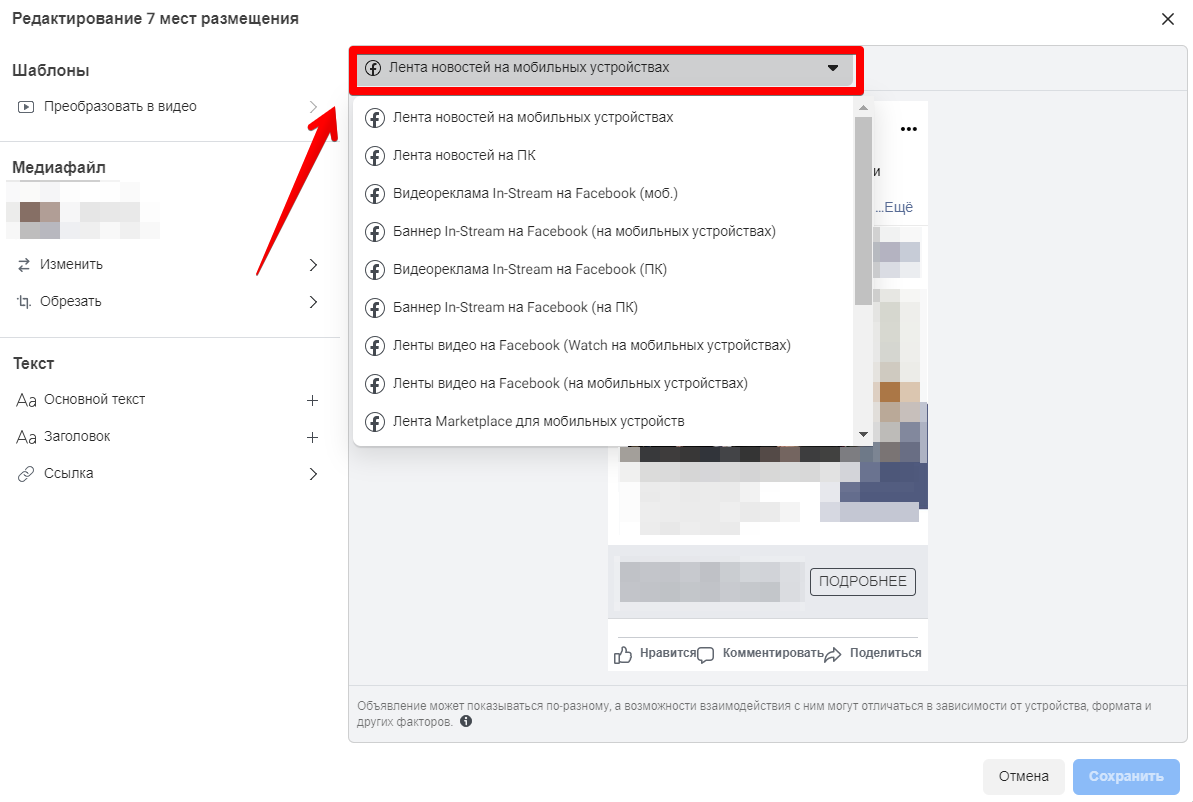 Натиснувши вгорі на випадаючий список, побачите перелік усіх місць розміщення, де буде показуватися ваша реклама. Справа буде попереднє оголошення, зліва — функціонал для редагування.