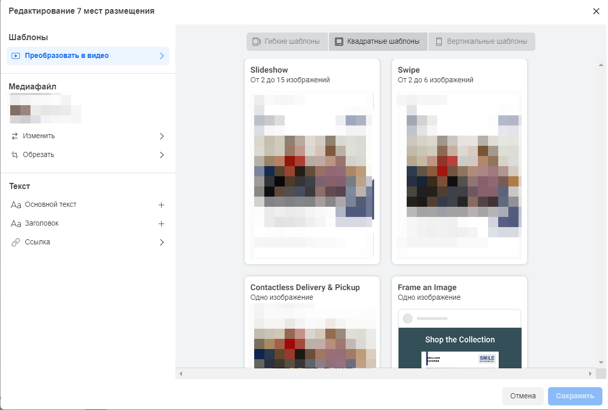 У низці плейсментів ми можемо використовувати виключно відео. Щоби не підбирати певний креатив під ці плейсменти, у вас є можливість скористатися функцією створення слайд-шоу. Натисніть на кнопку «Перетворити в відео» і виберіть один із представлених шаблонів. Якщо вам необхідно зробити слайд-шоу під сторіс, або ж у вас є тільки квадратний банер — ви можете його перетворити у відео у вертикальному форматі. Просто виберіть зі списку відповідний плейсмент і вам буде запропонована вибірка з вертикальних форматів відео.