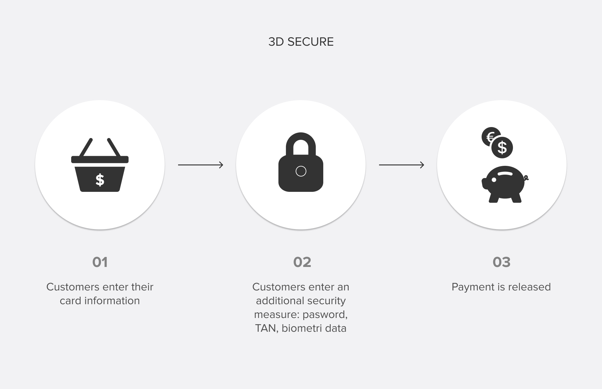 За замовчуванням в 3D-Secure використовується смс на фінансовий номер, прив'язаний до картки, код з якого, потрібно буде ввести на захищеній сторінці оплати. Це гарантує незалежність від особливостей пристрою, наприклад, якщо на телефон не можна встановити додаток банку або він не може підключиться до Мережі. Якщо у користувача смартфон, що підтримує технологію розпізнавання облич або відбитків пальця, підтвердити операцію можна з Face / Touch ID. А якщо встановлено банківський додаток — погодитися на списання, перейшовши за посиланням на також захищену сторінку всередині нього. Як тільки операція буде підтверджена, дані про можливість транзакції передаються в банк-еквайр, гроші списуються з рахунку покупця і перераховуються продавцю.