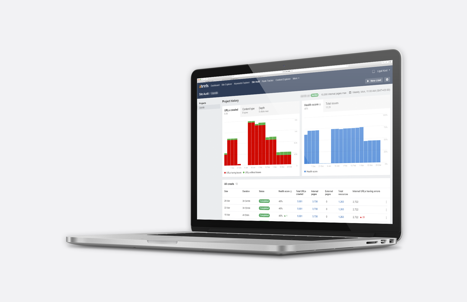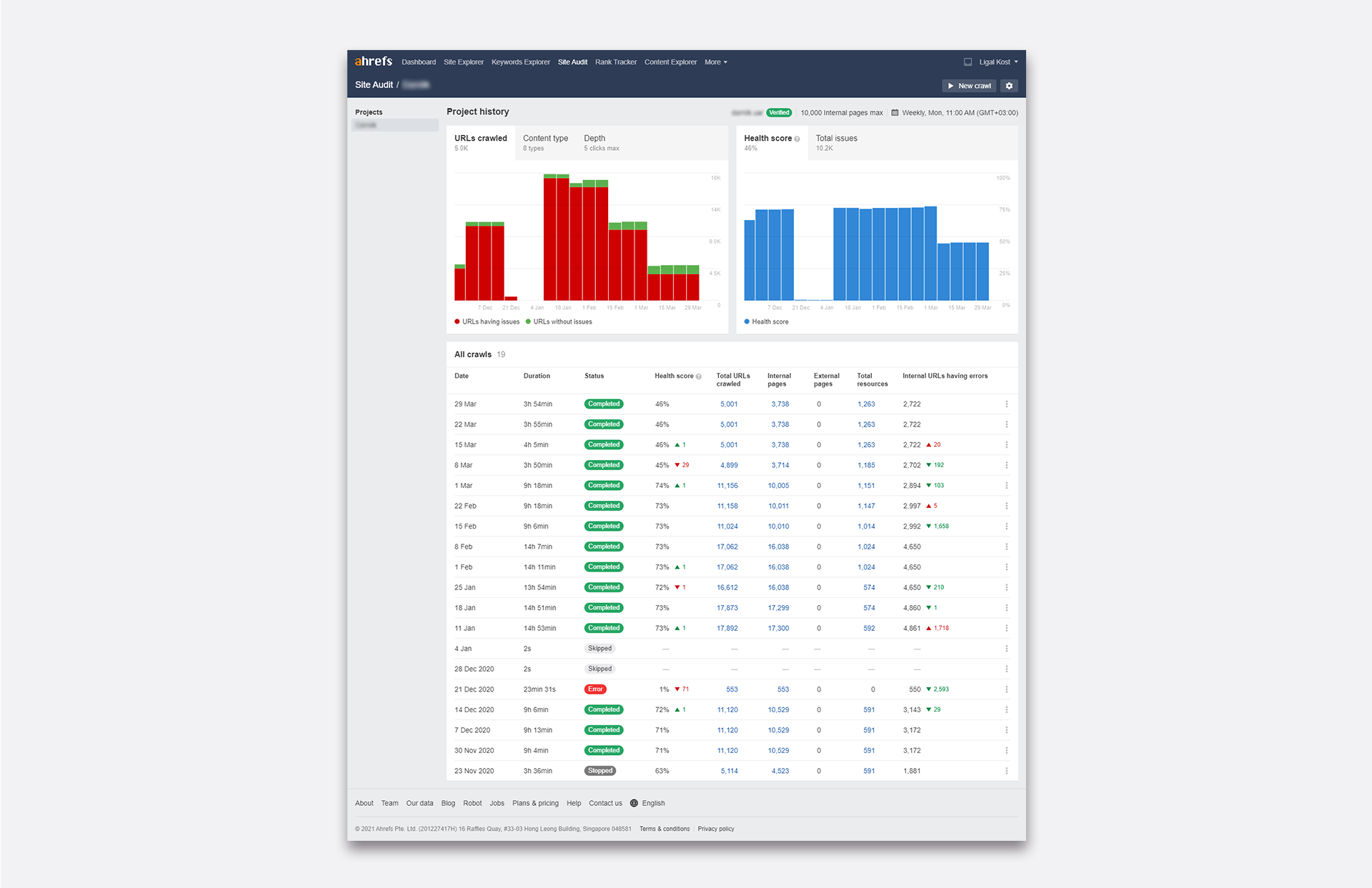 Як і всі хороші платформи для просування, Ahrefs вміє аналізувати поточний стан сайту. У ньому є потужні інструменти для сканування, які зберуть статистику, знайдуть помилки та порекомендують, як їх виправити. Ви можете самостійно обрати, які розділи перевіряти, якщо у вас на сайті тисячі сторінок і зможете спостерігати за результатами аудиту в реальному часі. Ахрефс тестує продуктивність і швидкість завантаження, перевіряє html-теги і якість локалізації, сканує вихідні та вхідні посилання, і звичайно ж контент і ресурси — зображення, JavaScript і CSS. Технічні фахівці люблять Ahrefs не тільки за те, що він полегшує і прискорює етап аналітики. Платформа допомагає відразу використовувати отримані дані для вирішення десятків різних завдань. Наприклад, ви зможете налаштувати точніші фільтри, що призначені для користувача, або знайти та виправити посилання, що дублюються, і все це в одному місці. Плюс, у системі можна задати інтервал проміжних перевірок — наприклад, щомісячну аналітику тільки тих сторінок і розділів, які ви зараз покращуєте і просуваєте.