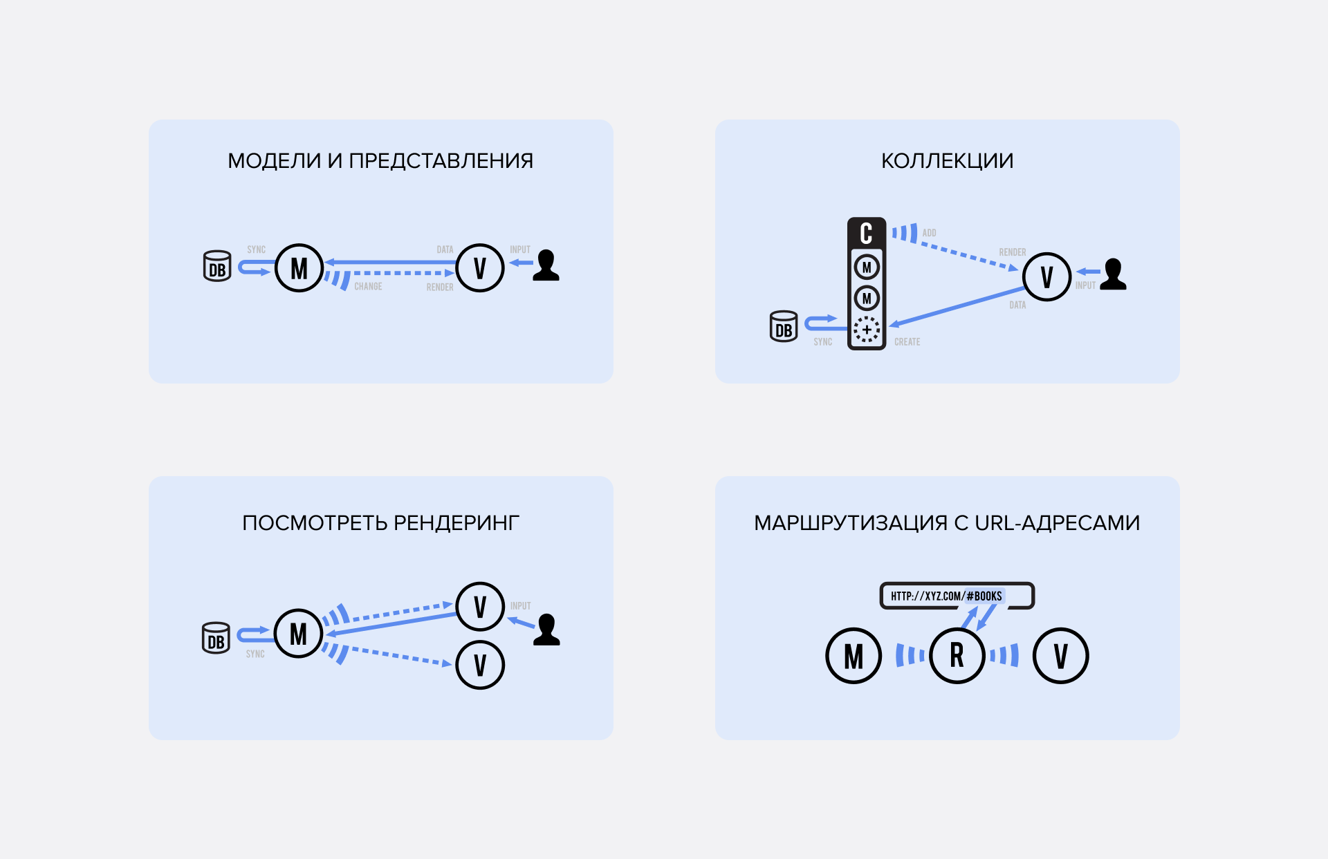 Модель (Model) в вебдодатку з Backbone.js., Як і в інших випадках, це база даних і бізнес-логіка. Вона відповідає за управління цими компонентами, завантаження даних з сервера і запуск події, при їх зміні. Вид (View) буде реагувати на ці зміни і перемальовувати UI, а також обробляти дії користувача з інтерфейсом і відправляти їх в Модель. Один про одного ці компоненти нічого не знають і взаємодіють тільки слухаючи і відправляючи події. Щоб все це працювало ще краще, моделі можна збирати в колекції, щоб відстежувати всі зміни в одному місці. Крім того, в Backbone.js є вбудована синхронізація з RESTful API, дозволяє налаштовувати рендеринг будь-яким зручним способом, додавати зручну маршрутизацію по URL і багато іншого. Все це — інструменти, які полегшують роботу над інтерфейсом, роблячи код вебдодатку чистим, структурованим і зрозумілим. Що не тільки прискорює розробку, і спрощує обслуговування, але і в цілому робить проєкт надійніше і стабільніше.
