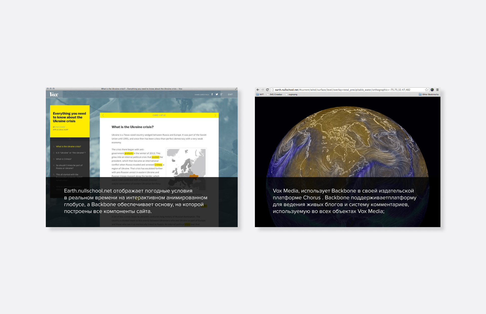 Backbone.js структурує код Javascript в стилі MV (Model-View) і додає події, колекції з API для функцій, і декларативну обробку подій для видів. Він дозволяє відокремити бізнес-логіку від призначеного для користувача інтерфейсу, і в результаті фронтенд-розробка пройде швидше, а результат буде якісніше.