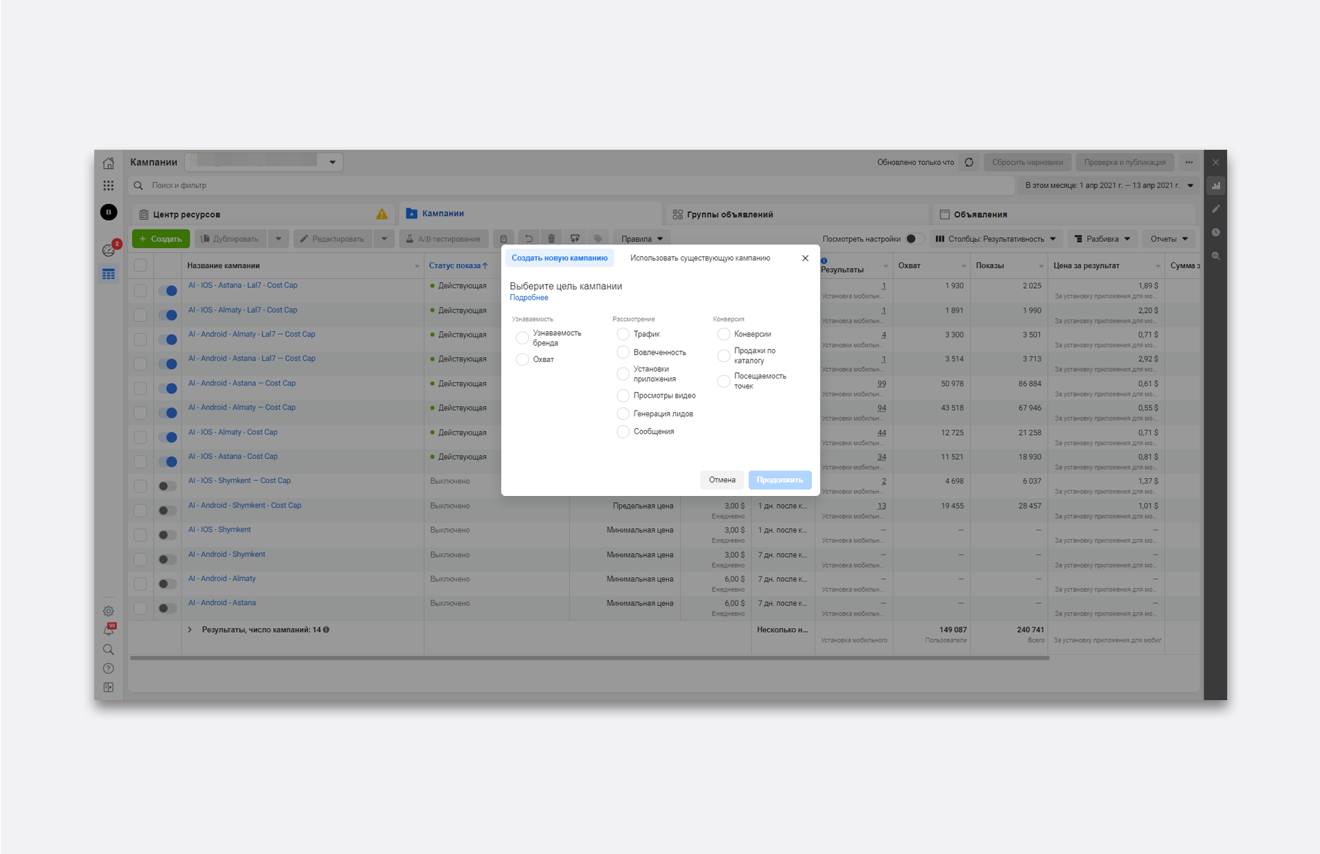 На цьому етапі вибирається мета таргетованої реклами (трафік, конверсія, впізнаваність бренду, залученість і інші). Фахівці налаштовують піксель на сайті або sdk Facebook в додатку. Готуються банери та відео.