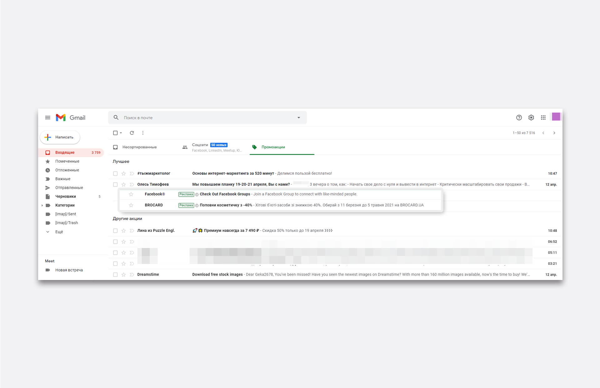 Реклама в пошті gmail з’являється в окремій вкладці з такою назвою й логічно використовувати її для тематичної e-mail розсилки. Якщо ви запускаєте акцію на честь свята чи розпродажу, або пропонуєте нові товари й послуги — розкажіть про це. Користувачі точно побачать ваше повідомлення — рекламні листи завжди з’являться у верхній частині, навіть на основній вкладці.