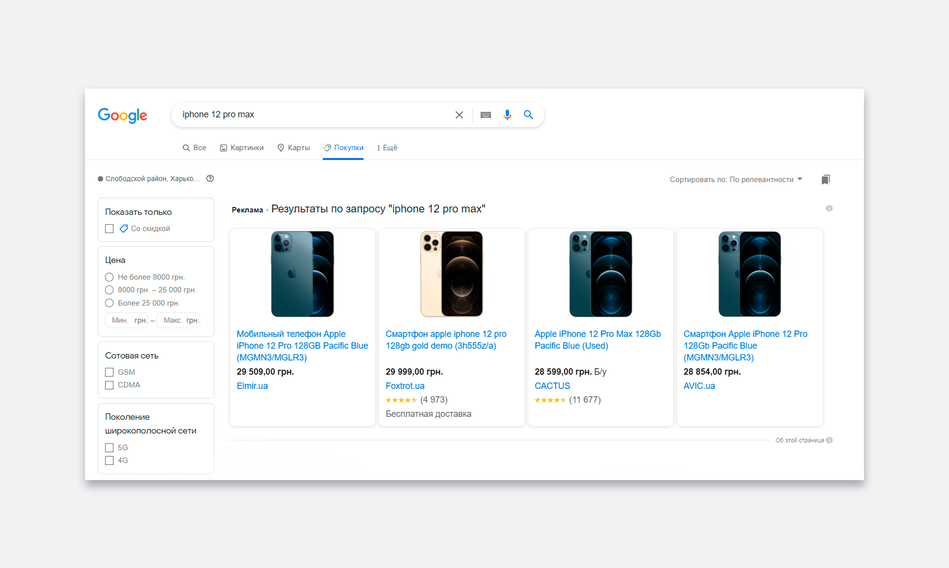 Реклама в Google Shopping — це перший рядок на сторінці пошукової видачі, великий блок праворуч від неї і окремий розділ «Покупки», в який заходять тільки ті, хто дійсно хоче купити. Це найтепліша аудиторія і найкраще місце для реклами, якщо подивитися на співвідношення ціни за клік і конверсії. По-друге, фіди GMC відмінне рішення для динамічного ремаркетингу, коли реклама показується тим користувачам, хто заходив на сайт, але так нічого і не придбав, або цікавився товаром в іншому магазині.