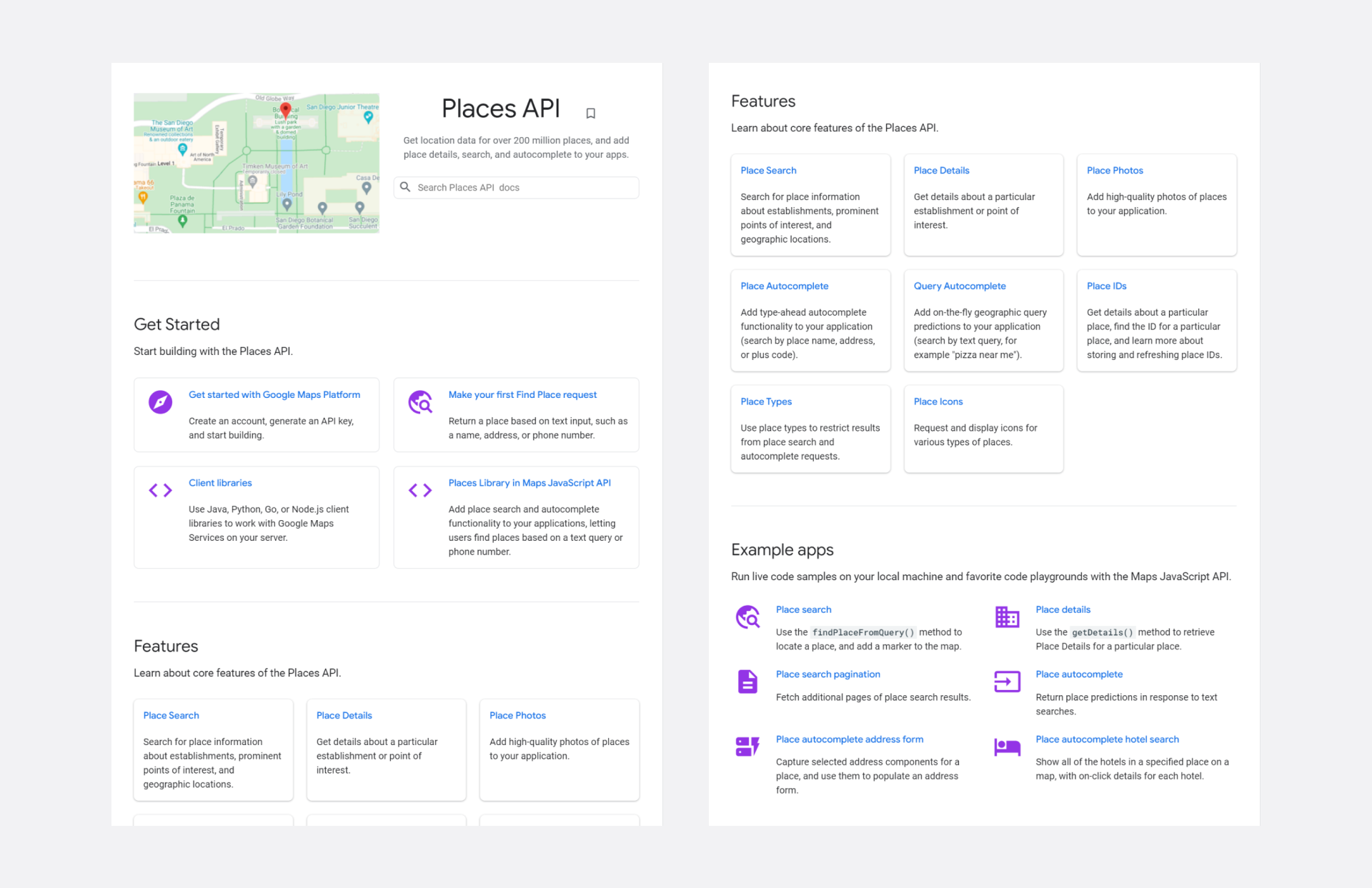 Google Places є частиною Google Maps Platform, яка відповідає за можливість показувати користувачам місця та пам’ятки з детальною інформацією про них на мапах. У платформу також входять набори інструментів Maps та Routes для побудови карт та відображення маршрутів.