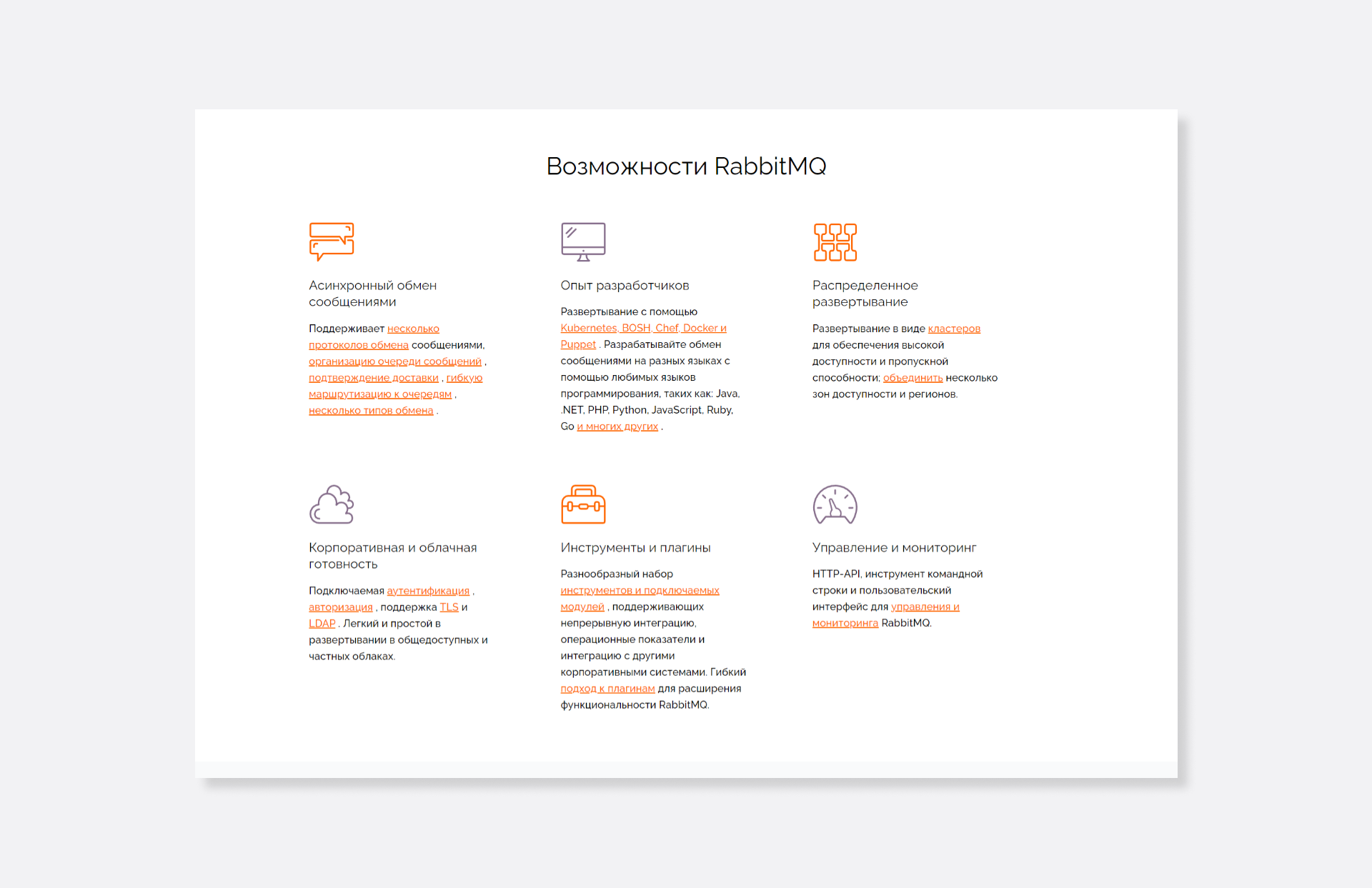 RabbitMQ підходить для проєктів на Java, PHP, C #, Objective-C, Swift, Python, JavaScript, Go і багатьох інших. Для кожної з підтримуваних мов є модулі і клієнти. Брокер повідомлень офіційно підтримується Linux, Windows і Windows Server, macOS і іншими операційними системами, для кожної з яких також є клієнтські бібліотеки. Крім того, у RabbitMQ є готові інтеграції з платформами для розробки й розгортання, і базами даних, а також інструменти для командного рядка.