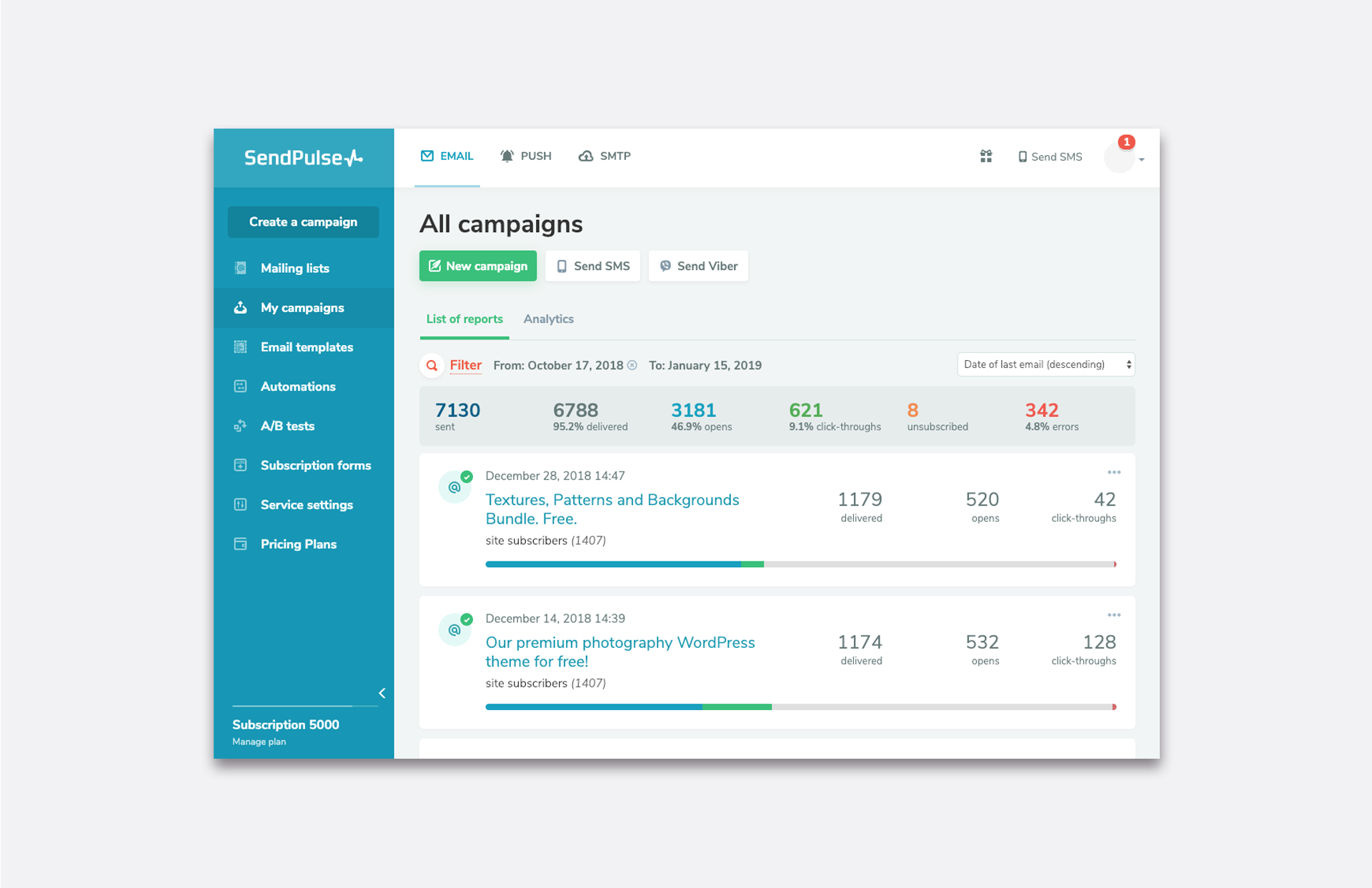 SendPulse — один з найпростіших і зручних сервісів для e-mail і sms розсилок. Це український продукт максимально доброзичливий до користувачів і популярний на нашому ринку. Крім базових функцій ви отримаєте можливість швидко і просто створювати чат-ботів, легку інтеграцію з поширеними CRM або CMS, фірмовий мобільний додаток, з яким зручно відстежувати результати кампанії, і в цілому відмінний і стабільний сервіс.